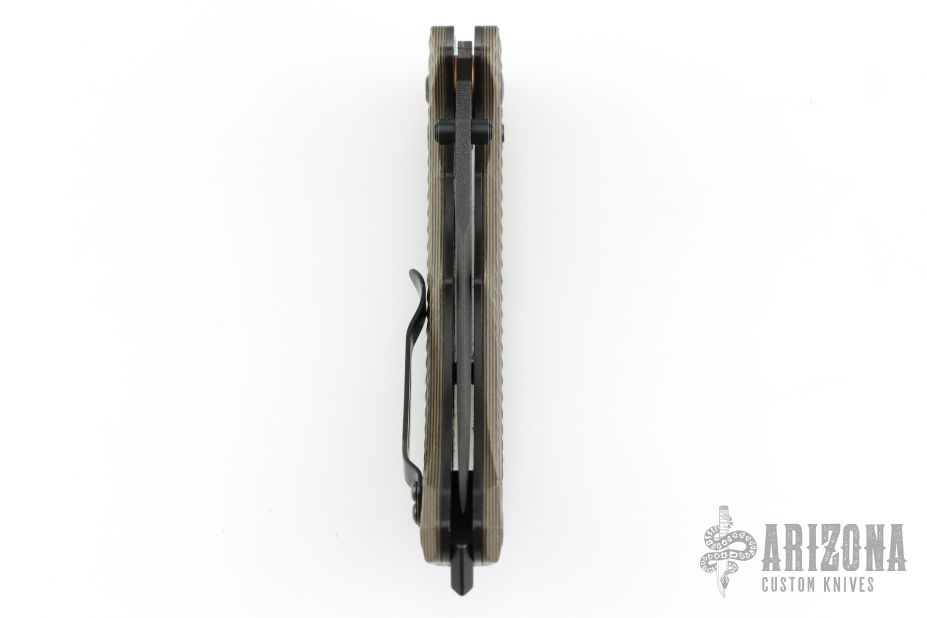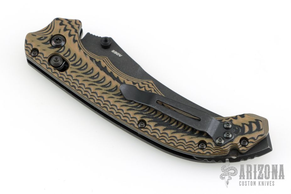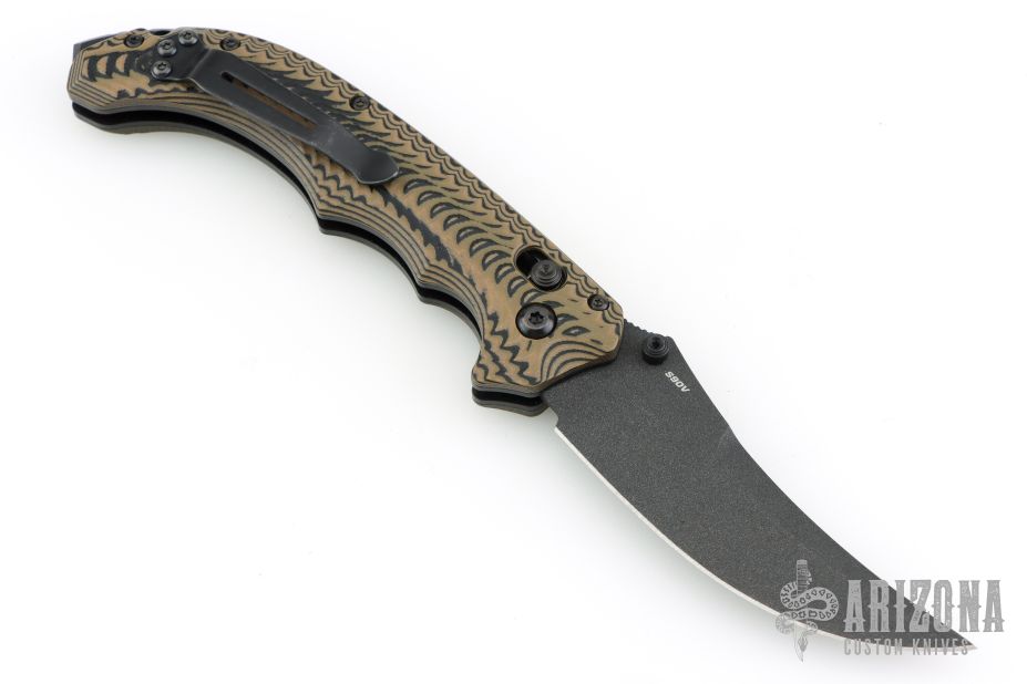 Compact tactical knife featuring a trailing-point CPM S90V blade with black Cerakote finish and thumb-stud opening for smooth one-hand use. The contoured G-10 handle (black/coyote/OD green) is aggressively textured for a secure grip, paired with an ambidextrous AXIS Lock and tip-up pocket clip. Includes the original box and papers. Excellent Condition.