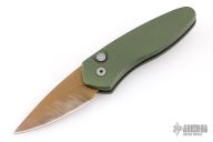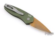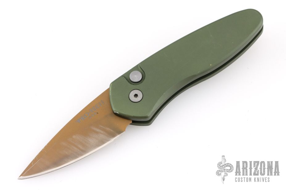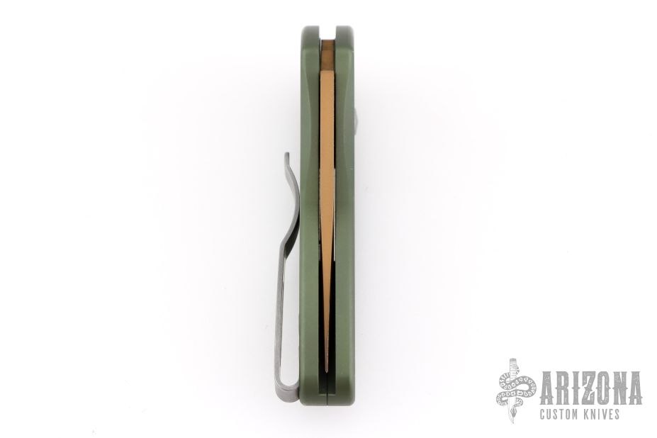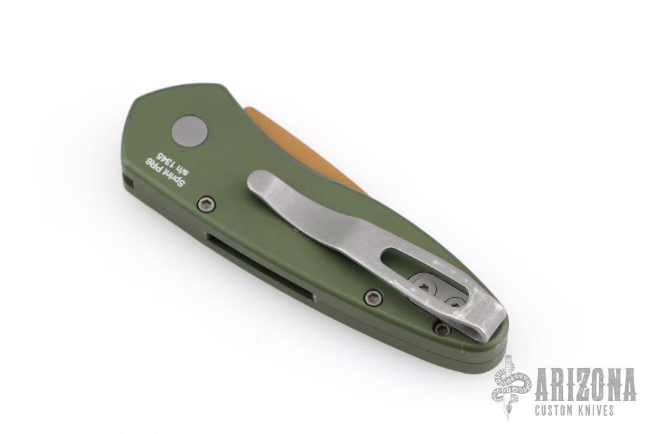 This Sprint by Pro-Tech has a matte copper coated blade and a green aluminum handle. Bead blasted stainless steel clip. Comes with original box and papers. Has scuffs and scratches, has been sharpened, otherwise good user condition.