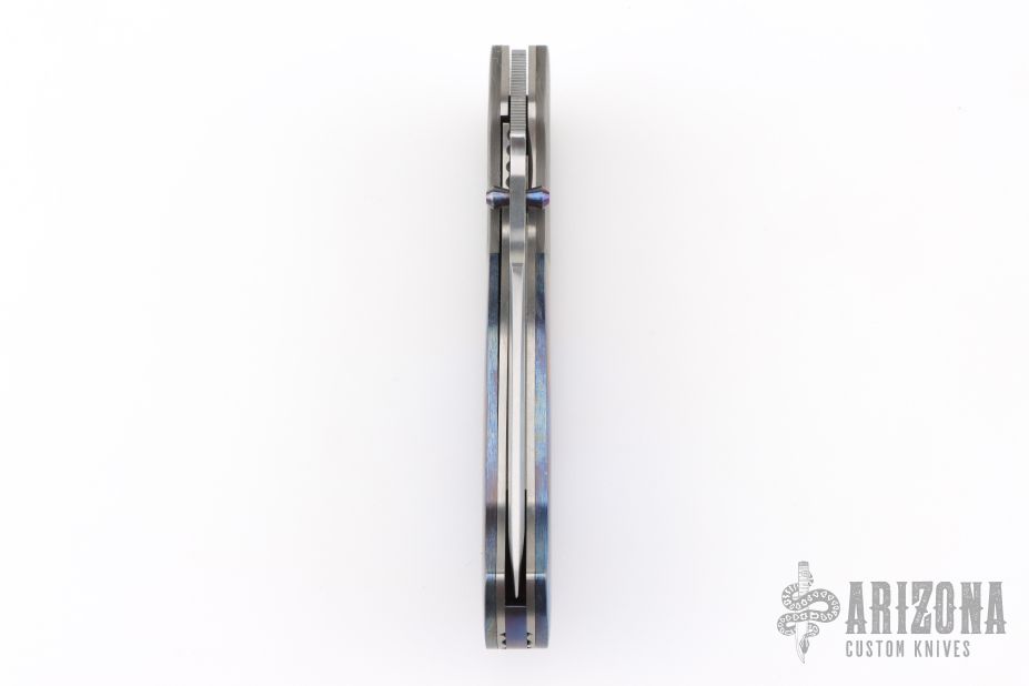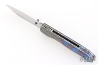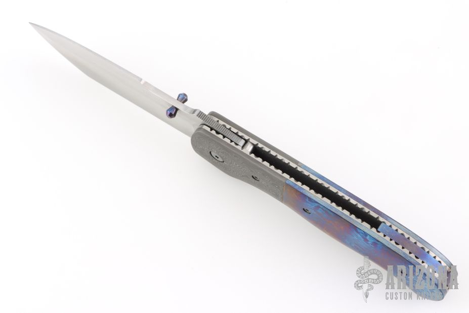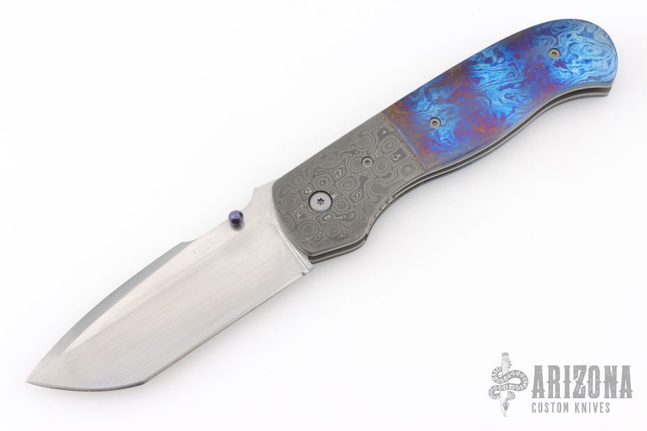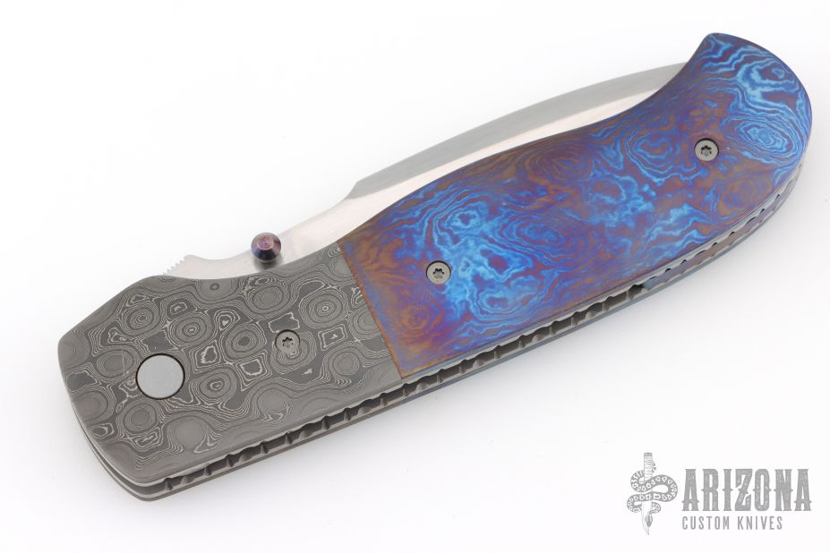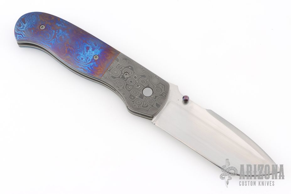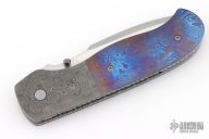 This Hunter Linerlock by Marty Young features a hand rub satin finished blade with false top edge and a thumbdisc and notched thumbrest. The handle features raindrop Damascus bolsters, file worked satin finished titanium liners, Timascus covers, and backspacer. Comes with zippered case. Has a couple very light scratches, otherwise excellent condition.