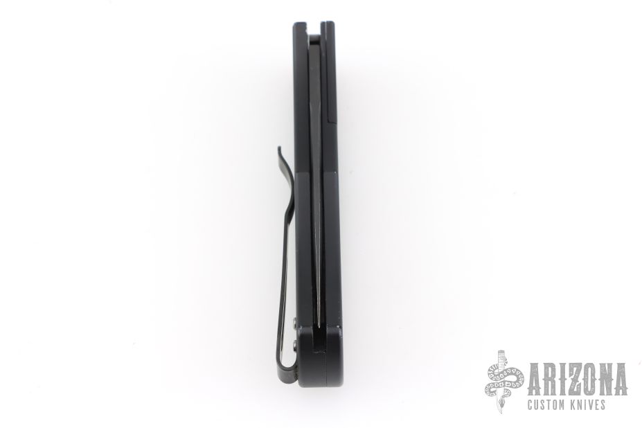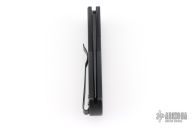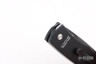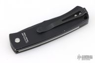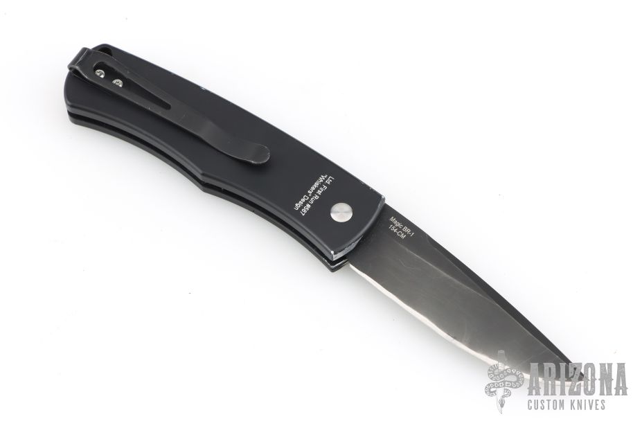 This BR-1.7 by Protech Knives features a black blade, false top edge. The handle has an aluminum frame with aluminum bolster release, stainless backspacer and tip up black stainless clip. Lanyard hole at the butt. Has some scuffs and scratches, has been sharpened, otherwise good user condition.