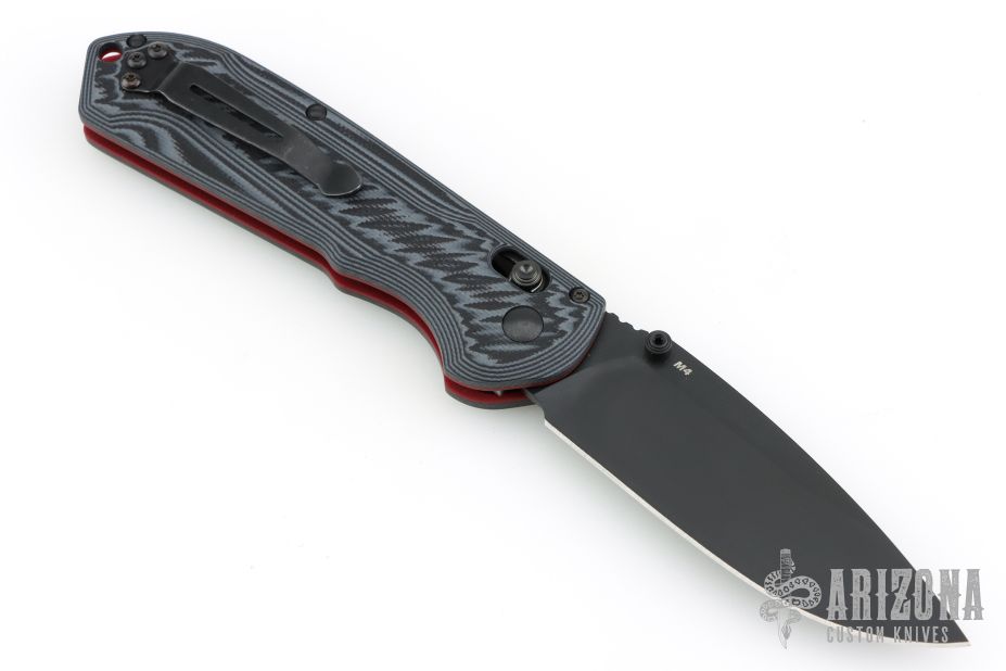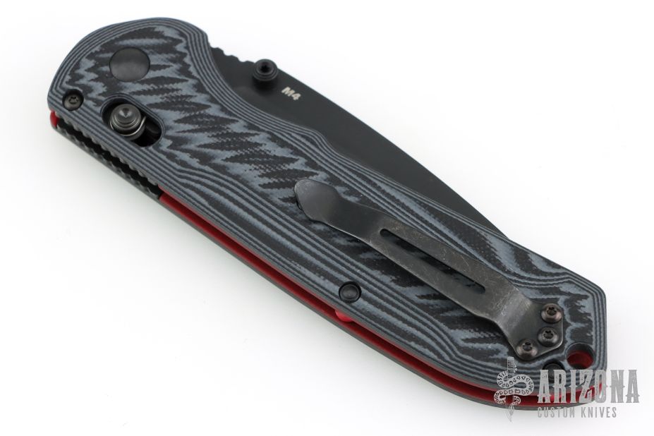 The FREEK, by Benchmade, features a drop point CPM-M4 steel blade with a black finish, dual thumb studs and a notched thumb ramp. The handle is composed of black/grey G-10 and red G-10 liners, black tip up reversible stainless tip pocket clip. Comes with original box, papers, and drawstring pouch. Excellent condition.