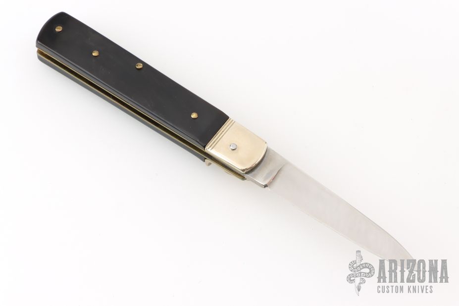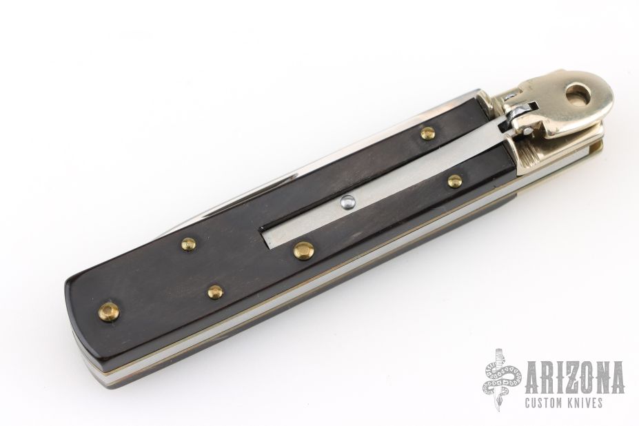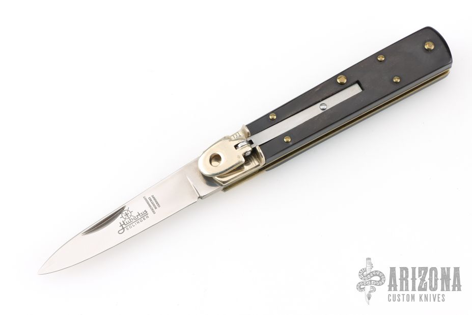 This leverlock auto by Hubertus features a high polish blade, nickel silver bolsters, buffalo horn scales, and brass liners and pins. Opens with a nice snap. Very fast opening. Excellent condition.