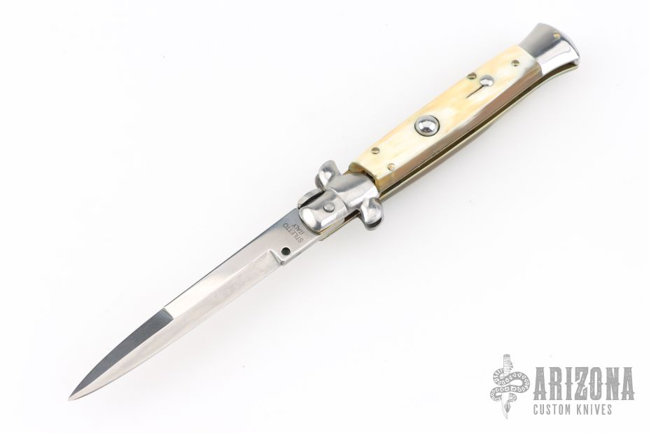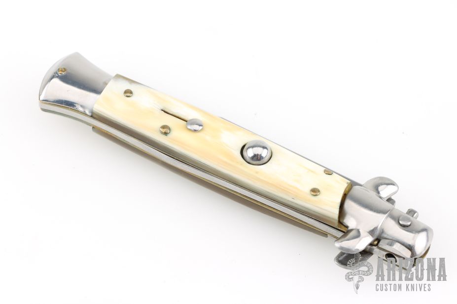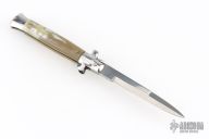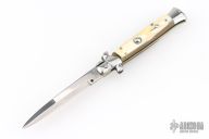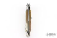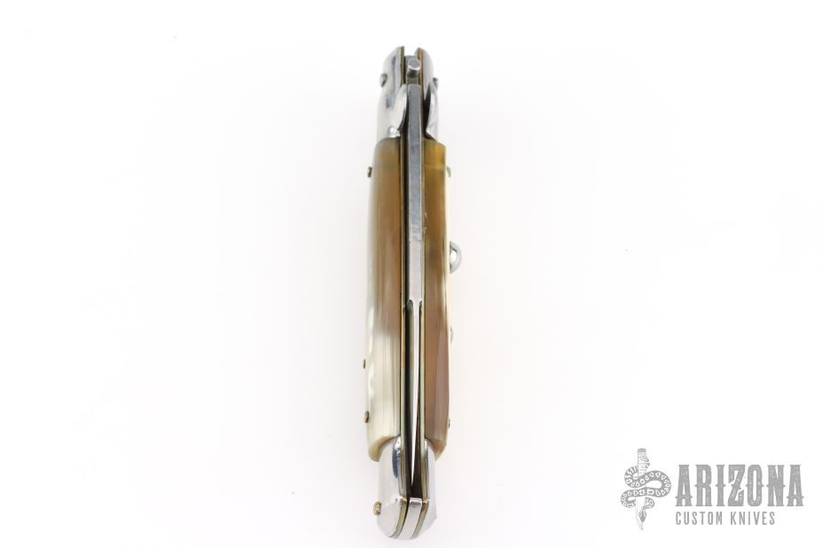 This Swivel Bolster from Stiletto Italy features a bayonet ground blade with false top edge. The handle is comprised of stainless steel bolsters and pommel with honey horn scales over brass liners and stainless steel backspacer. Has some light scratches, has been sharpened, otherwise good condition.