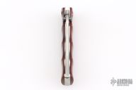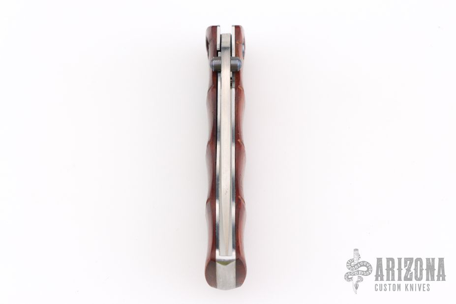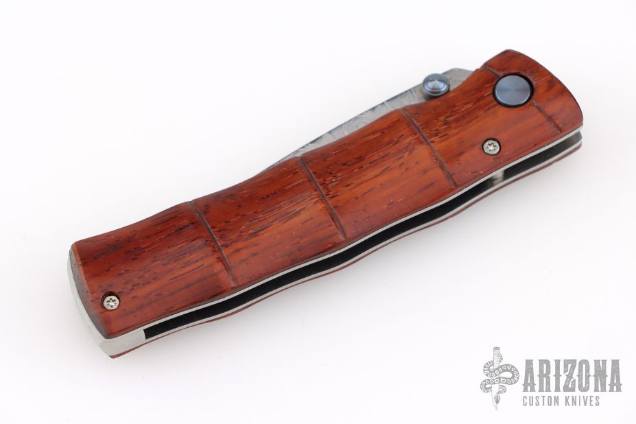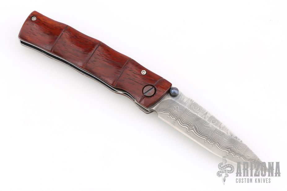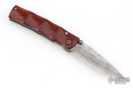 This Bamboo Linerlock from MCUSTA features a drop point San Mai Damascus blade with dual thumb studs. The handle is comprised of bamboo styled wood over steel backspacer. Has some scuffs and scratches, great overall condition.