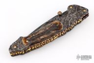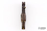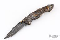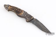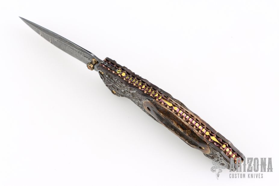 I make folders and balisongs and my preferred handle material is carved or inlayed pearl, but it is very dangerous to work with as it will crack with the slightest error. For this reason, the number of knives I can make is limited to the mistakes I make. Because most of my knives go in collections I use a great deal of mosaic damascus created by Robert Calcinore and Tony Metsala. I believe this steel radiates boldness and brings my knives to life. I also use ATS-34, because it is strong and good for daily use. My personal favorite is Chad Nichols stainless Damascus steel, because it is beautiful and works well for everyday carry knives. Another characteristic of many of my knives is my spring mechanism.