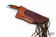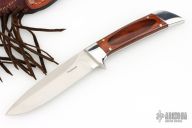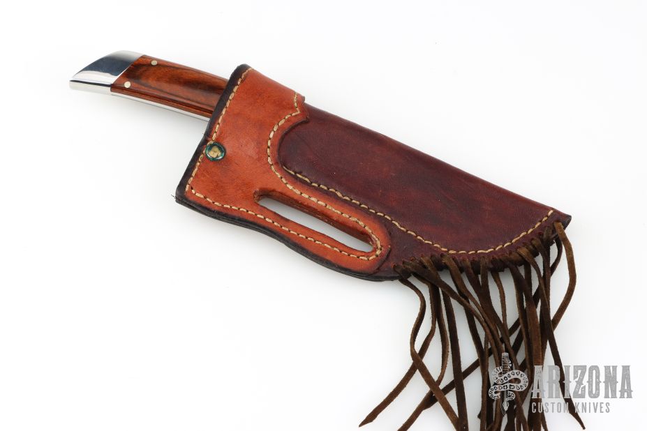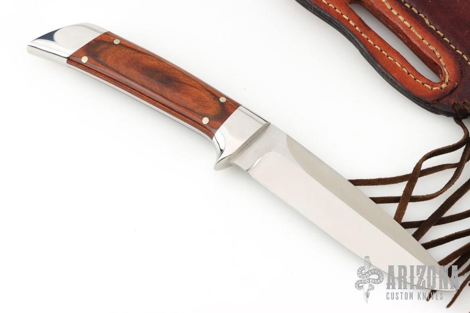 This knife by GT Bowman features a satin finished blade with sharpened top edge, .166" blade stock and 1.075" blade depth, full tapered tang construction. The handle has polished stainless steel bolsters, front and rear, dymondwood scales with nickel silver pins. Comes with a brown leather sheath and a zippered case. Excellent condition.
