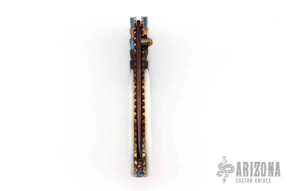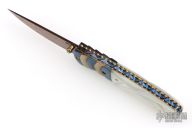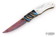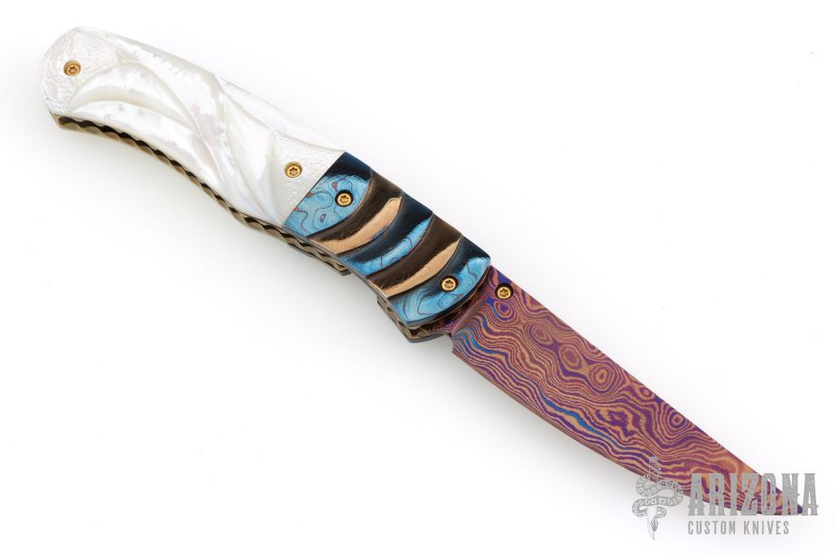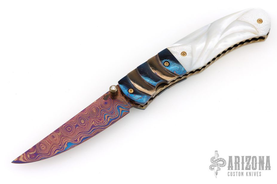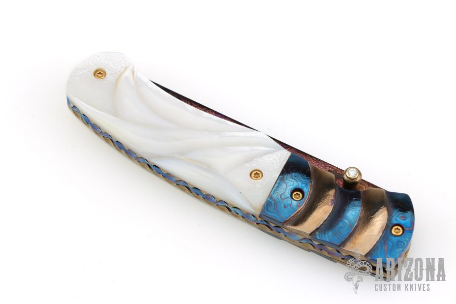 This knife features a Blued Damascus blade with a single thumbstud with stone inlay. The handle has carved, blued, Damascus bolsters, with carved pearl covers, fileworked and anodized titanium liners and backspacer. Gold-plated screws. Has a few light scratches, otherwise excellent condition.