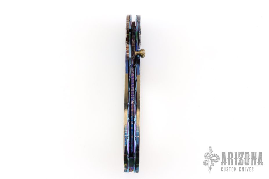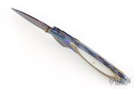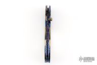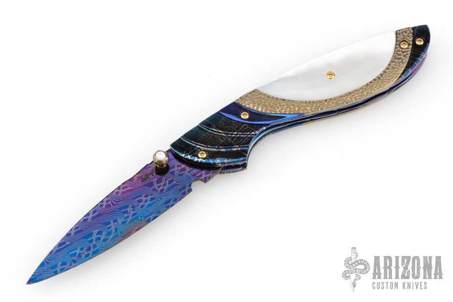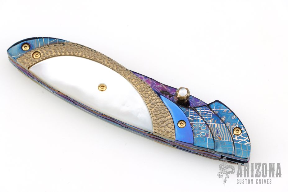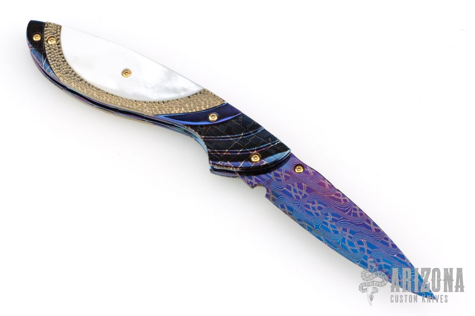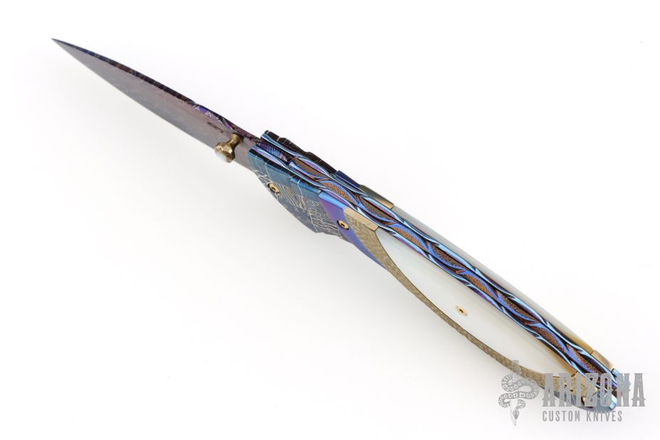 This linerlock by Suchat Knives features a blued Damascus blade with single thumbstud with a pearl inlay. The handle has blued mosaic Damascus bolsters, pearl scales, rear Damascus bolsters, fileworked anodized titanium liners with file worked anodized backspacer, and gold plated screws. Nice detent, lockup and blade seating. Excellent condition.