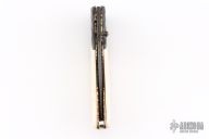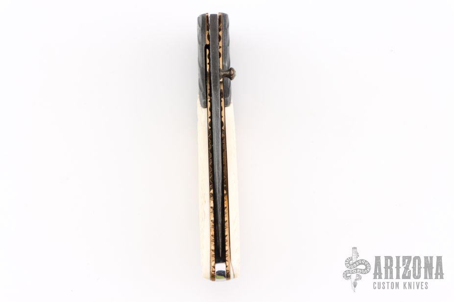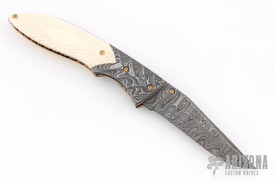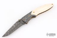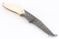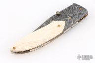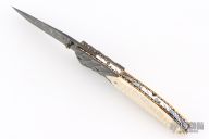 This knife features a Damascus blade with a single thumbstud with stone inlay. The handle has carved Damascus bolsters, with checkered bone covers, fileworked and anodized titanium liners and backspacer. Gold-plated screws, stone and peal inlays on the backstrap. Has a few light scratches, otherwise excellent condition.