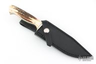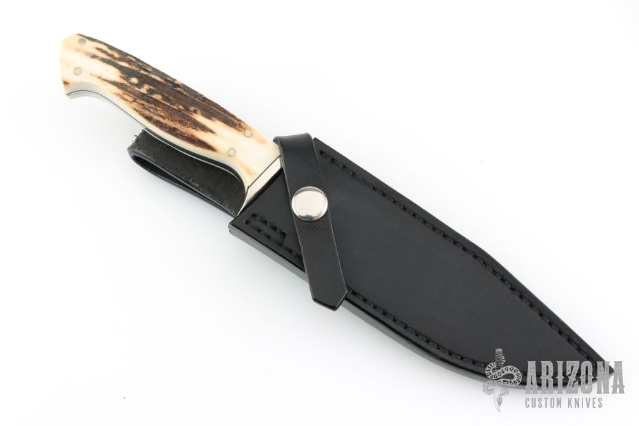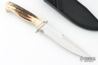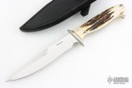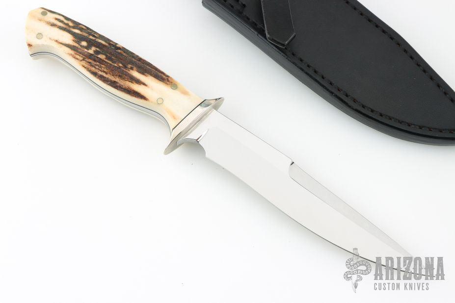 This knife by GT Bowman features a mirror finished blade with a nearly sharpened top edge, .212" blade stock and .994" blade depth, full tapered tang construction. The handle has a nickel silver guard, stag scales with nickel silver pins and black liners. Comes with a black leather sheath. Excellent condition.