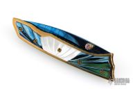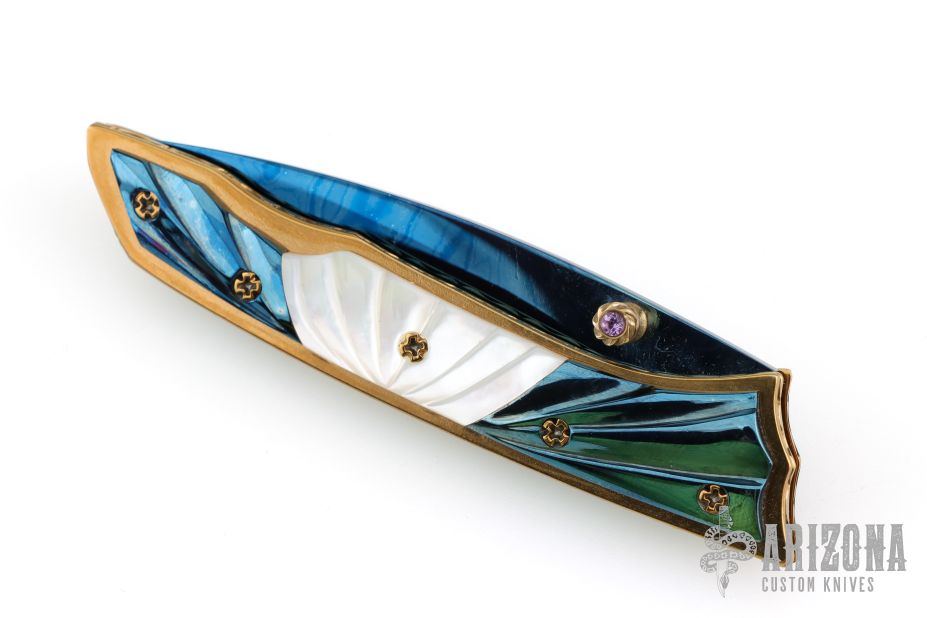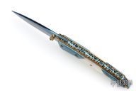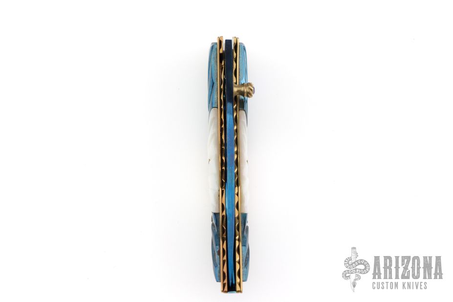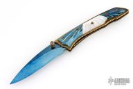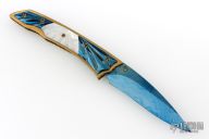 This linerlock by Appaloosa Knives features a Damascus blade with a single thumbstud with stone inlay. The handle has pearl, and blued Damascus inserts. It also has file-worked anodized titanium liners and a fileworked anodized backspacer. Nice detent, blade seating and lockup. Excellent condition.