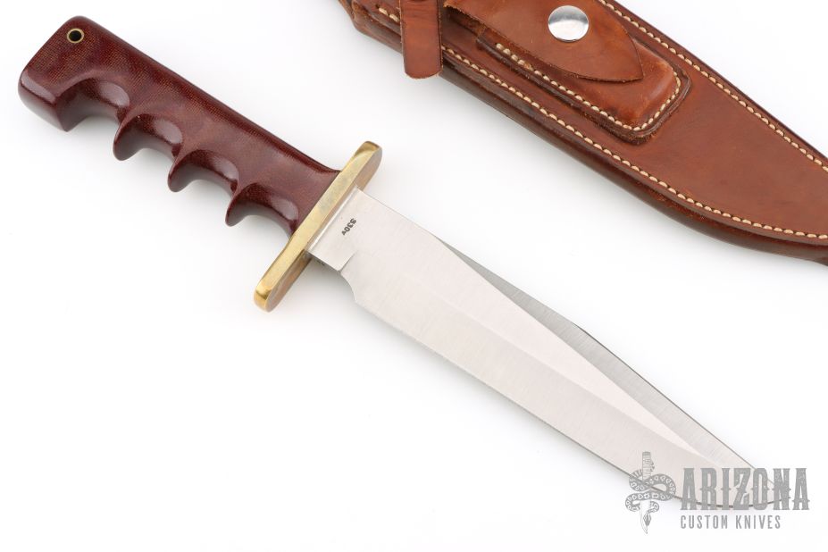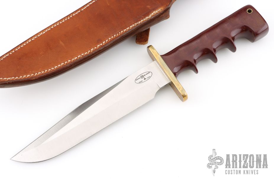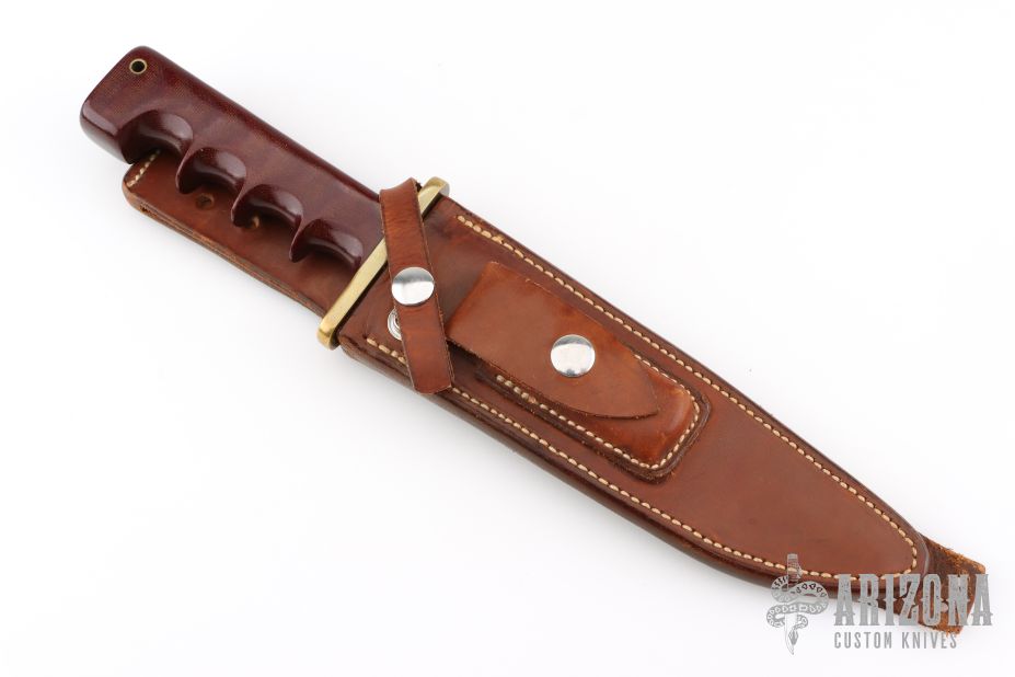 This fighter from Martin Knives features a satin finished spear point blade with a sharpened top edge, .215" blade stock and 1.468" blade depth, full tang construction. The handle has a brass guard and a red canvas micarta grip with lanyard hole at the butt.  Includes a brown leather sheath with a sharpening stone. Has some light scratches, otherwise excellent condition.