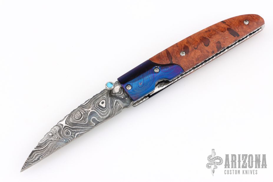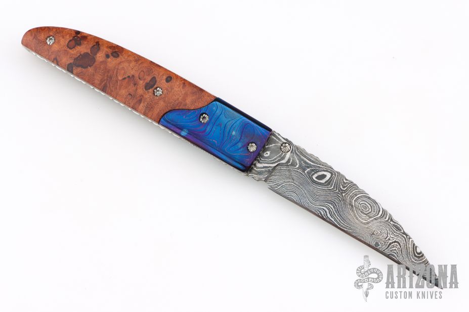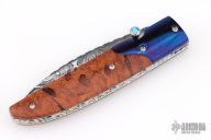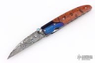 This linerlock by Appaloosa Knives features a Damascus blade with fileworked spine and a single thumbstud with blue stone inlay. The handle has wood scales and blued Damascus bolsters, fileworked stainless steel liners and backspacer. Nice detent, lockup and blade seating. Has a few light scratches, otherwise excellent condition.