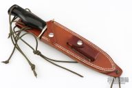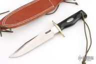 This Model 14 by Randall Made Knives features a satin finished blade with sharpened top edge, .226" blade stock, 1.395" blade depth, full tang construction. The handle has a nickel silver guard, black linen micarta handle with a lanyard hole at the butt, nickel silver escutcheon with "JHH" engraved on it. This knife was designed to meet the demand for an almost indestructible all-purpose knife, though it is especially suited for combat and survival purposes. Comes with a brown leather sheath. Has some scratches and some light oxidation at the tip, otherwise good condition.