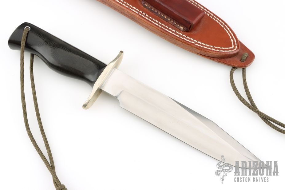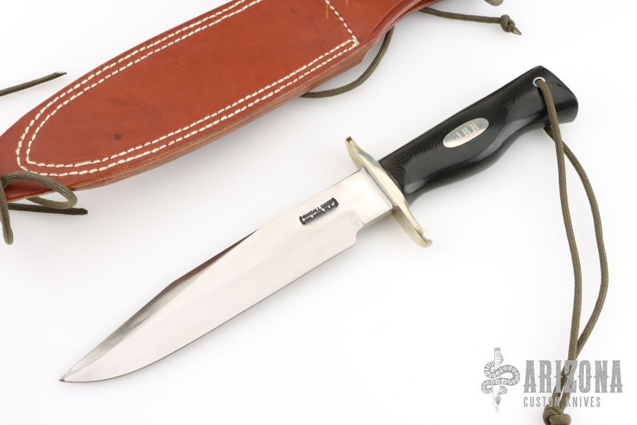 This Model 14 by Randall Made Knives features a satin finished blade with sharpened top edge, .226" blade stock, 1.395" blade depth, full tang construction. The handle has a nickel silver guard, black linen micarta handle with a lanyard hole at the butt, nickel silver escutcheon with "JHH" engraved on it. This knife was designed to meet the demand for an almost indestructible all-purpose knife, though it is especially suited for combat and survival purposes. Comes with a brown leather sheath. Has some scratches and some light oxidation at the tip, otherwise good condition.