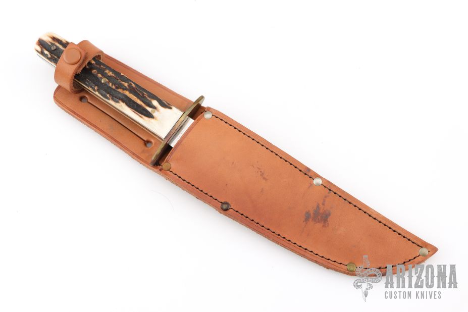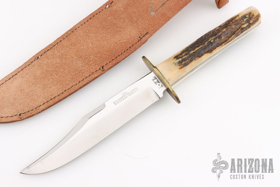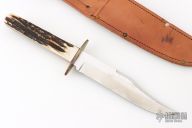 This IXL Bowie by George Wostenholm and Son features a clip point blade with false top edge, satin finished grinds and mirror polished flats, .190" blade stock and 1.075" blade depth, full tang construction. The handle has a brass guard and stag scales with brass pins. Comes with a brown leather sheath. Excellent condition.