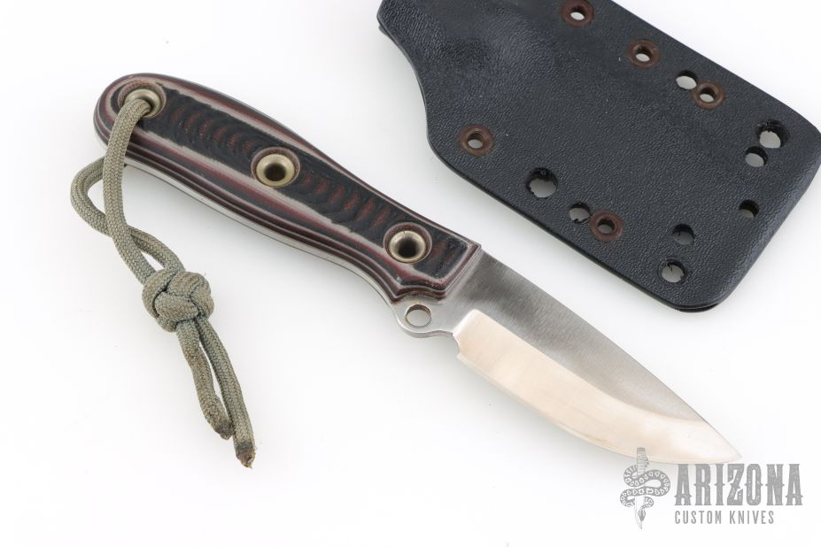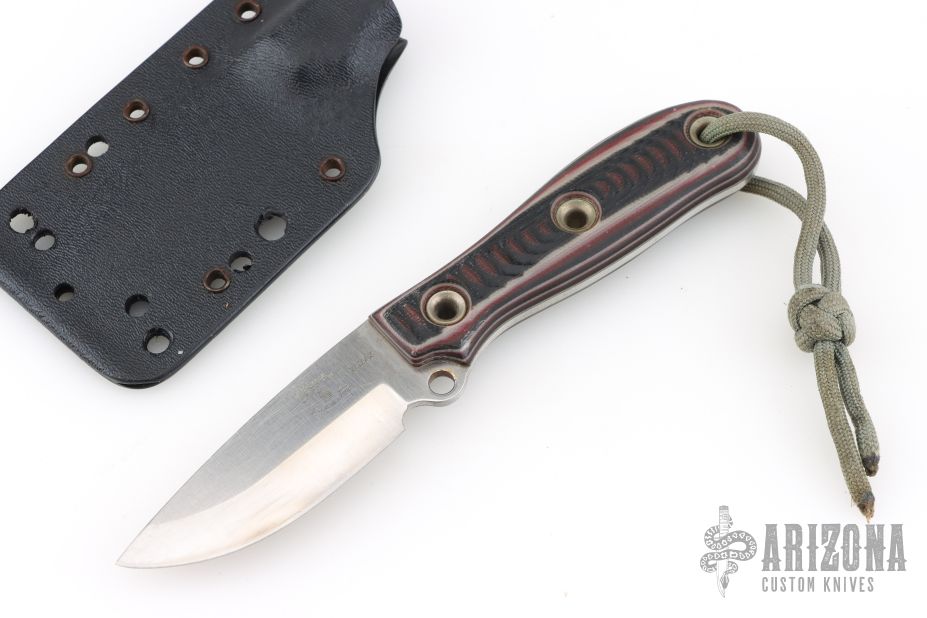 This Custom Shop Max Warden by Busse features a drop point satin finished ELMAX blade, .090" blade stock and 1.071" blade depth, full tang construction. The handle has black/red/white G-10 scales with lanyard hole at the pommel. Comes with a Kydex sheath. Has been used and sharpened, has scratches, good user condition.