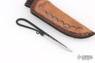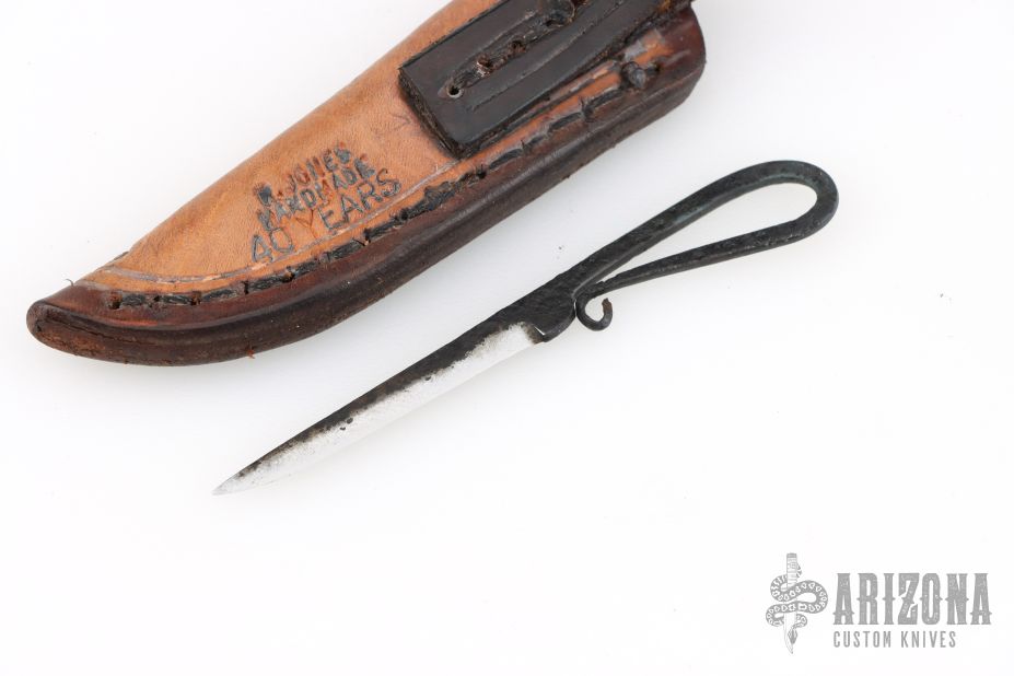 This Miniature Hand Forged knife by Roger "Mudbone" Jones features a satin finished blade with forge finished flats and handle. The handle is delicately forged with a coach whip tail. Comes with a two-tone hand-tooled brown leather sheath with "R. JONES HANDMADE 40 YEARS" on the back. Excellent condition.