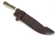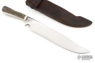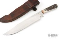 This Bowie by Shiva Ki is full tang construction with .250" blade thickness and 1.971" blade depth. The blade is mirror polished. The handle has stag scales with brass pins. Great feel in hand, for a knife this size it flows through the air like a breeze. Comes with a brown leather sheath. Has a few light scratches, otherwise excellent condition. Shiva Ki stands behind his lifetime warranty of free reconditioning and sharpening service on all of his knives.