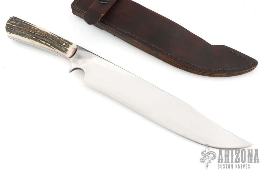 This Bowie by Shiva Ki is full tang construction with .250" blade thickness and 1.971" blade depth. The blade is mirror polished. The handle has stag scales with brass pins. Great feel in hand, for a knife this size it flows through the air like a breeze. Comes with a brown leather sheath. Has a few light scratches, otherwise excellent condition. Shiva Ki stands behind his lifetime warranty of free reconditioning and sharpening service on all of his knives.