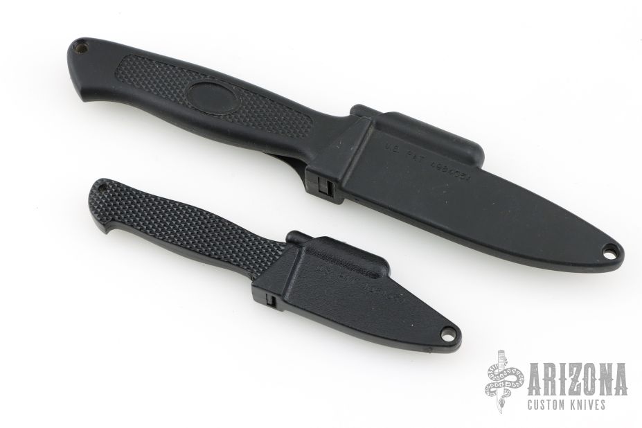 The larger knife has a satin finished blade with .055" blade stock and .699" blade depth, hidden tang construction with a black grip. Comes with a locking plastic neck sheath. Excellent condition. 3" blade 6.75" overall.
