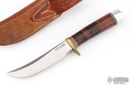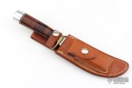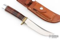 This Model 4-5 by Randall Made Knives features a satin finished blade with false top edge, .216" blade stock and 1.049" blade depth, hidden tang construction. The handle has a brass guard, stacked leather grip with red/white/blue spacers, duralumin butt. Comes with a brown leather sheath with sharpening stone and baby dot buttons. Has some light scratches, otherwise excellent condition for its age.
