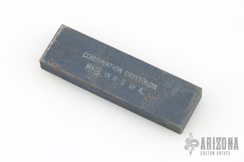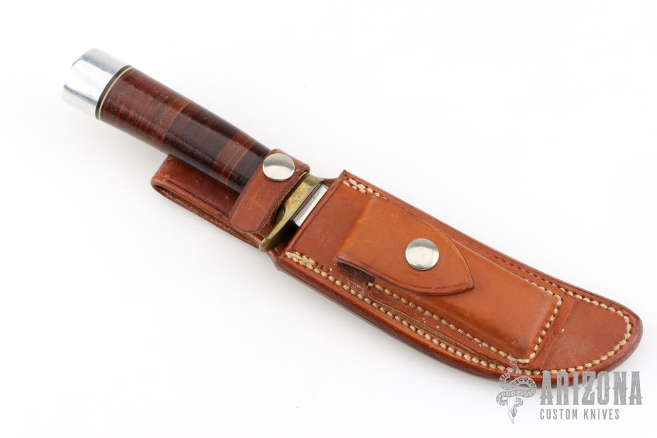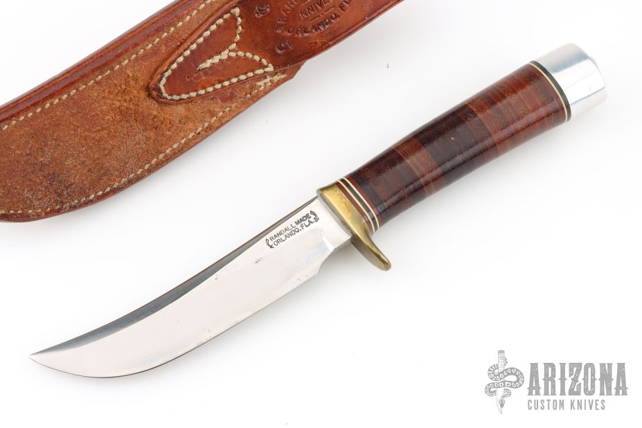 This Model 4-5 by Randall Made Knives features a satin finished blade with false top edge, .216" blade stock and 1.049" blade depth, hidden tang construction. The handle has a brass guard, stacked leather grip with red/white/blue spacers, duralumin butt. Comes with a brown leather sheath with sharpening stone and baby dot buttons. Has some light scratches, otherwise excellent condition for its age.