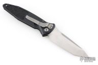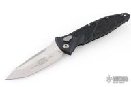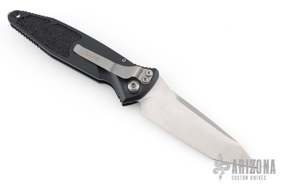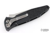 This Socom Elite Auto by Microtech has a stonewashed tanto blade with a notched thumbrest. Black aluminum handle with non-slip inserts. Stainless steel clip, tip down carry. Glass breaker. Dated 06/2025 and s/n 18996. Comes with original box and papers. Excellent condition.