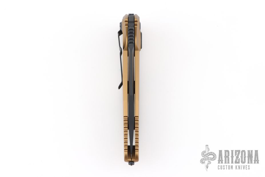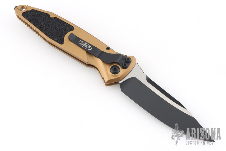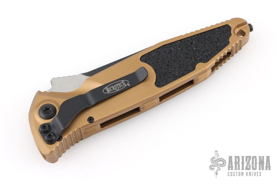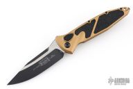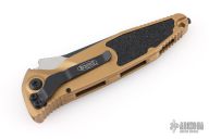 This Socom Elite Auto from Microtech has two toned drop point blade with notched thumbrest. The handle has a tan aluminum frame with non-slip rubber inserts and a tip down stainless steel clip, black hardware. Dated 09/2024 and S/N 14039. Has a couple light scuffs on the clip/button, Excellent condition overall.