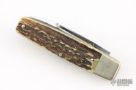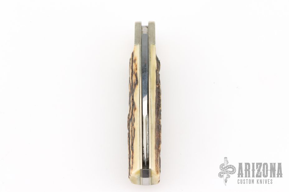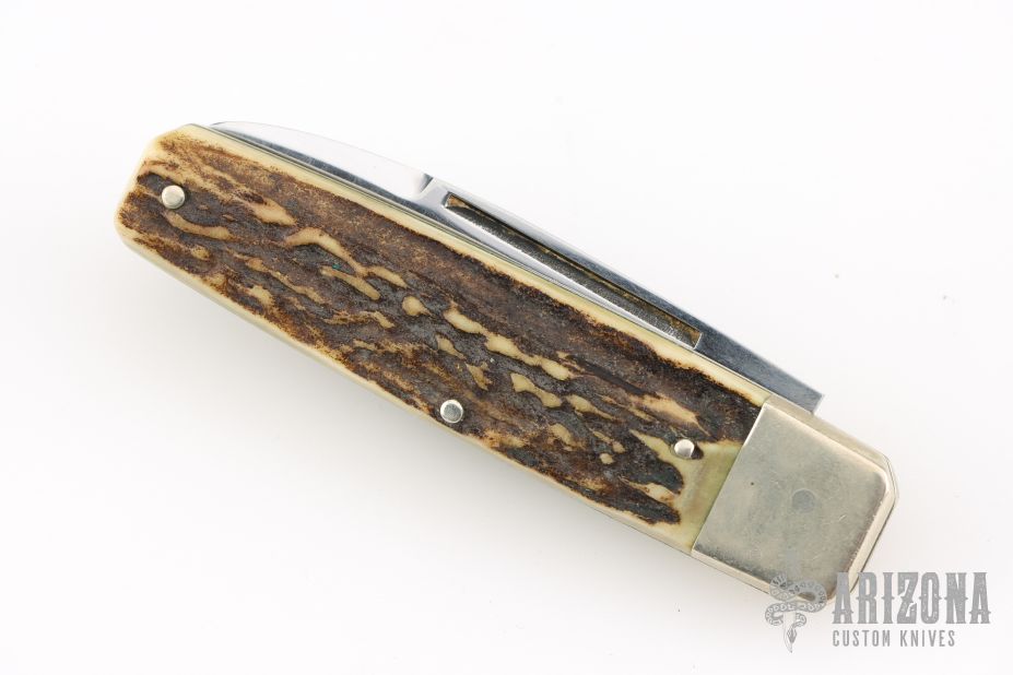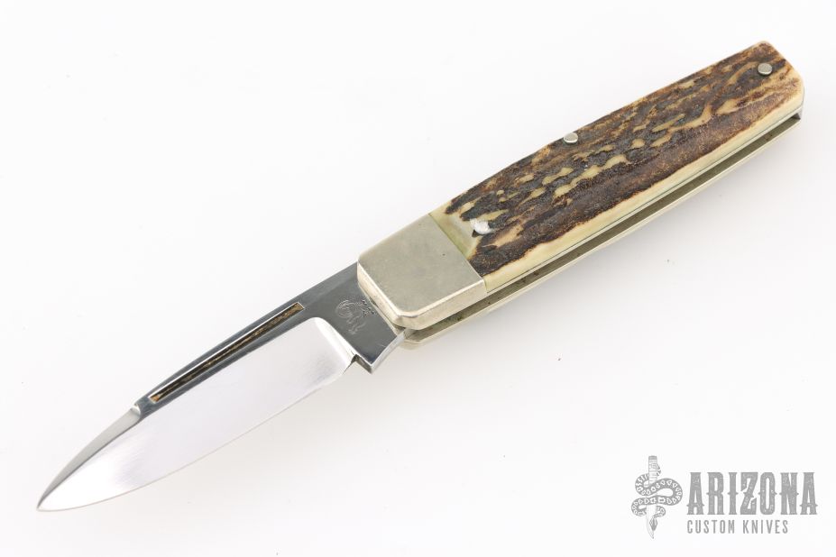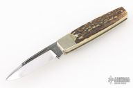 This knife by Bertram was made for Hen and Rooster, it features a mirror finished blade with a nail nick. The handle features nickel silver bolsters and liners, stag scales, steel spring. Has scratches, otherwise good condition.