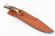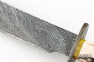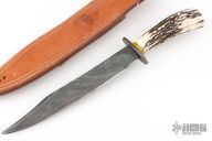 This Fighter by Master Smith Joe Cordova features a Cable Damascus blade with false top edge, .206" blade stock and 1.279" blade depth, hidden tang construction. The handle has a blued steel guard, stag grip, amber spacer, ivory paper micarta butt with scrimshaw of a hawk by "DTN" (i think those are the initials). Comes with a brown leather sheath. Excellent condition.