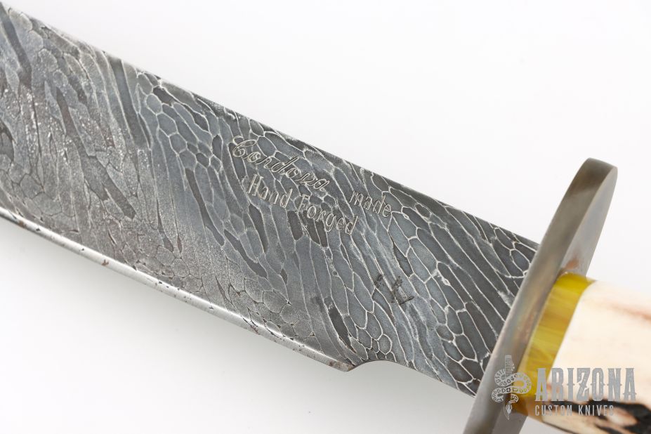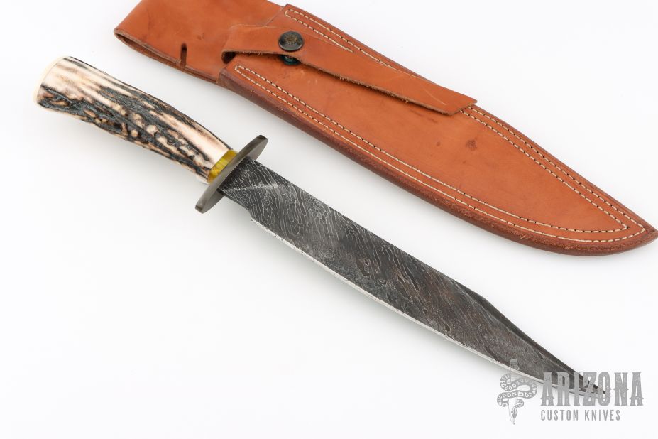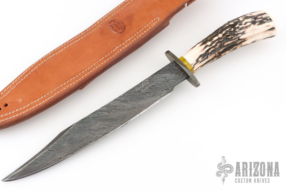 This Fighter by Master Smith Joe Cordova features a Cable Damascus blade with false top edge, .206" blade stock and 1.279" blade depth, hidden tang construction. The handle has a blued steel guard, stag grip, amber spacer, ivory paper micarta butt with scrimshaw of a hawk by "DTN" (i think those are the initials). Comes with a brown leather sheath. Excellent condition.