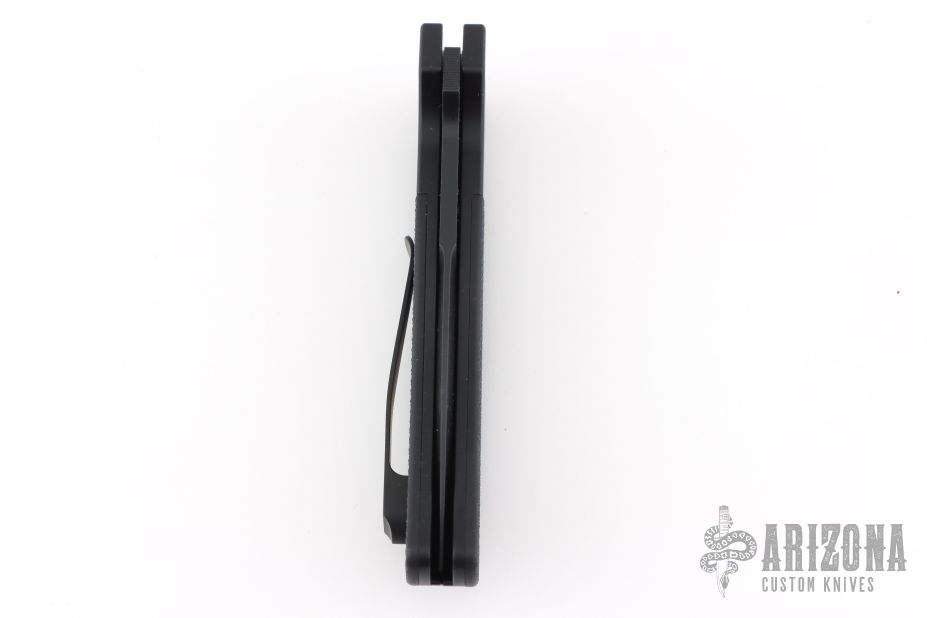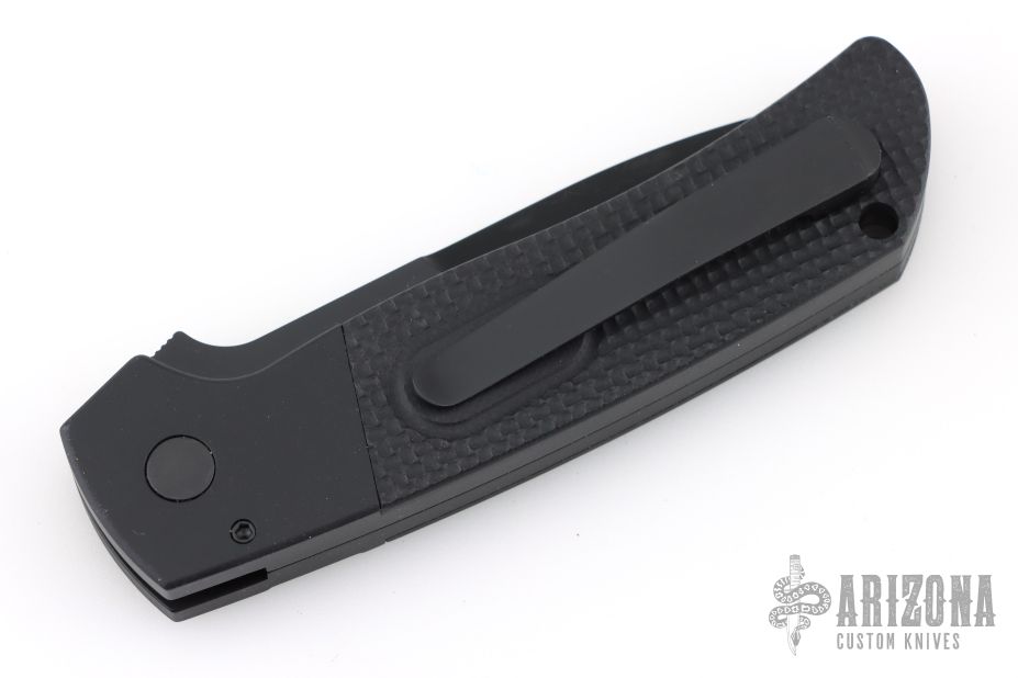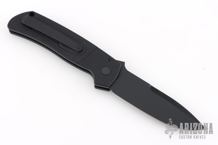 This ATCF Auto by Pro-Tech features a black Magnacut blade with notched thumbrest. The handle has a black aluminum frame with textured G-10 scales, tip up milled titanium clip with hidden screws.  Comes with original box, pouch, and papers. Has some light scratches on the body, great overall condition.
