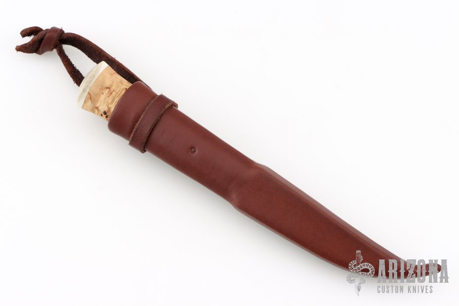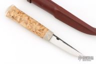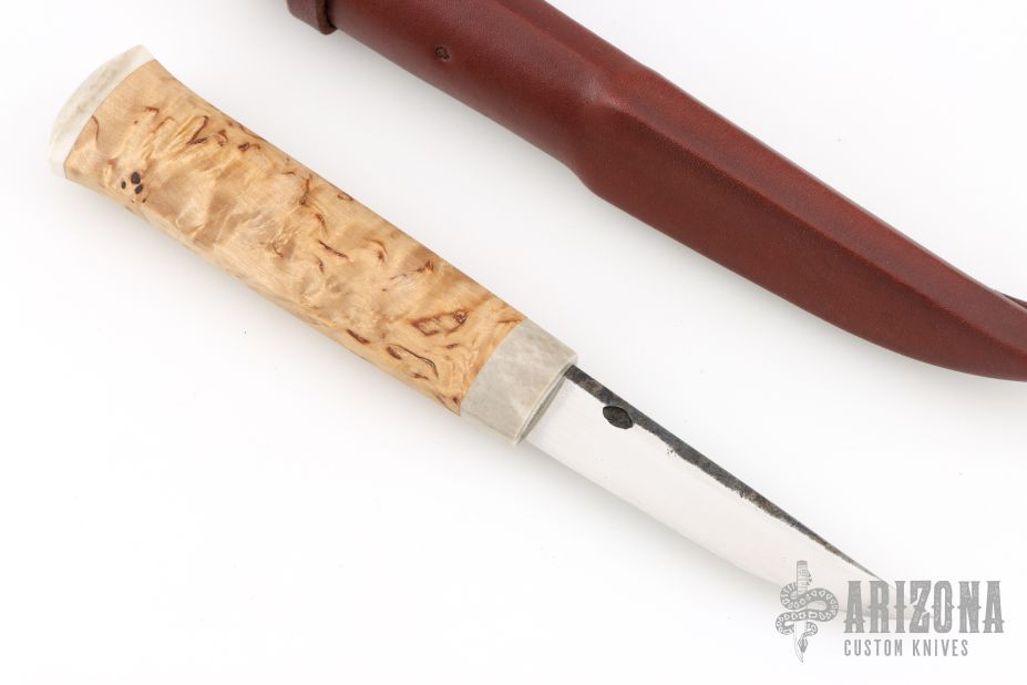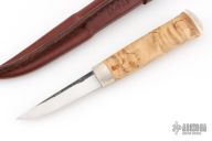 This Custom Puukko by Jaakonaho Arts & Design features a hand rub satin finished blade with forged finished flats, .166" blade stock and .690" blade depth, hidden tang construction. The handle has reindeer antler guard and butt with a curly birch grip. Comes with a brown leather sheath dated 2021. Excellent condition.