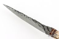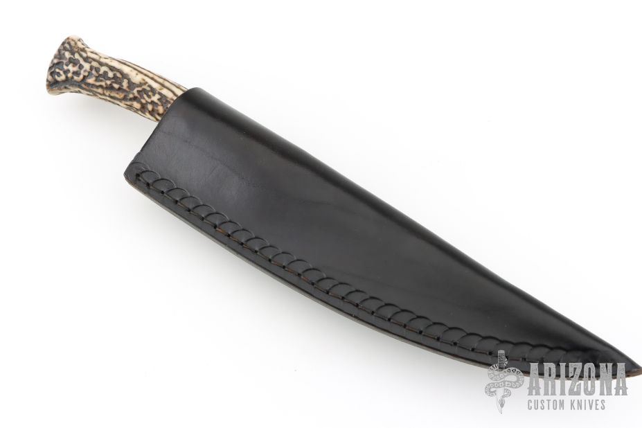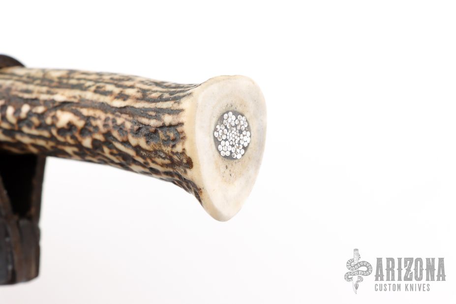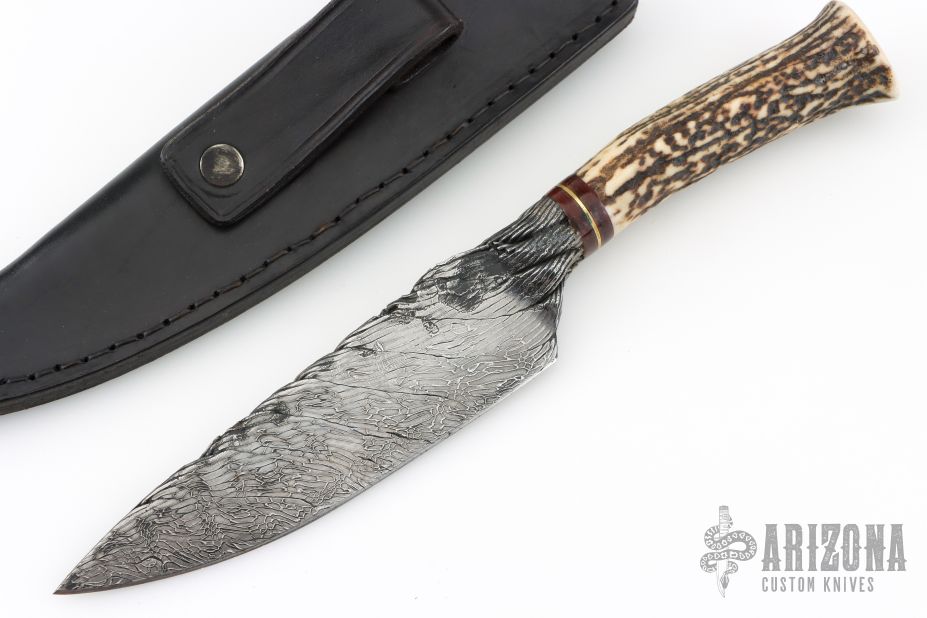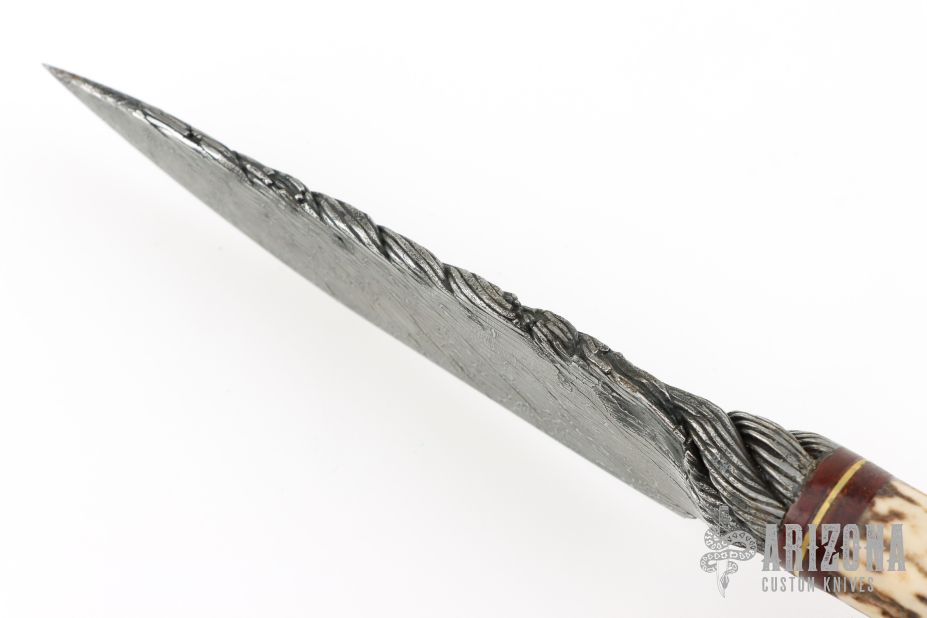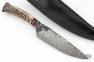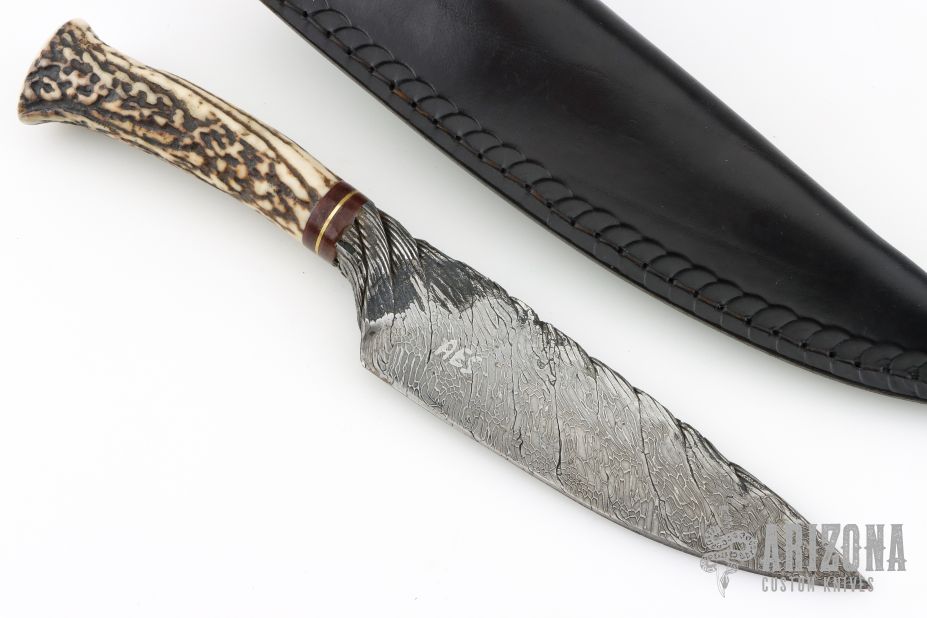 This knife by Ariel Elias Salaverria features a Cable Damascus blade with integral bolster, .218" blade stock and 1.613" blade depth, hidden tang construction. The handle has a stag grip with a leather and brass spacer between the handle and the blade, has a mosaic cable inlay in the butt. Excellent condition. Comes with a black leather sheath.