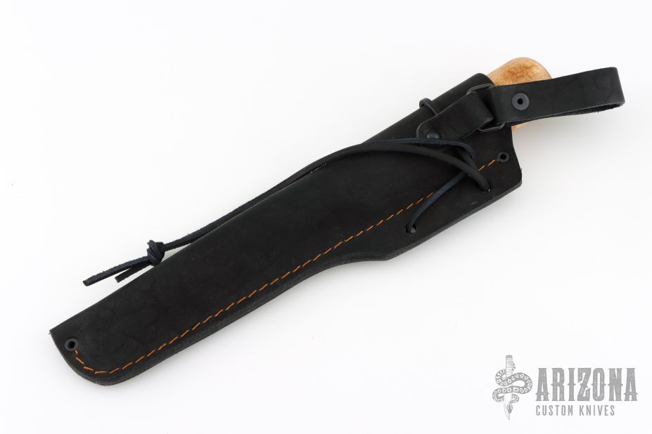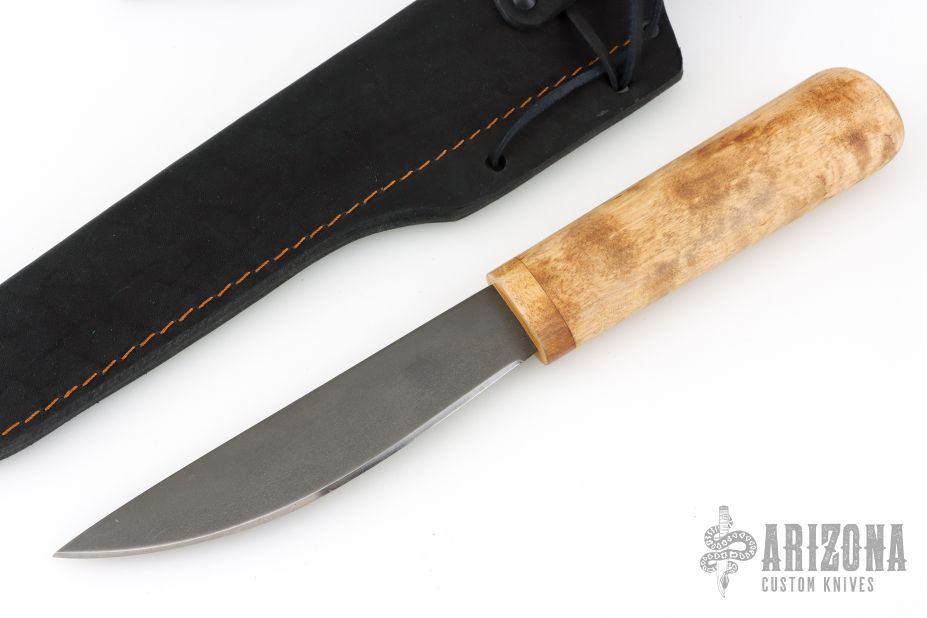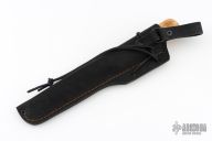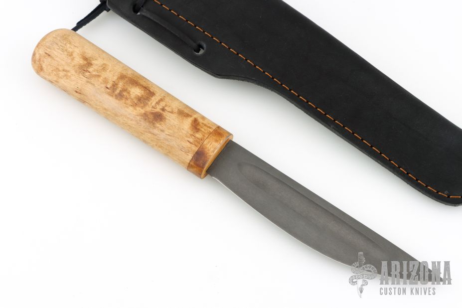 This Siberian Yakut Knife by Ivan Fedorovich Lopukhov features a Russian Bulat Wootz Steel chisel ground blade with fuller on the flat side, .140" blade stock and 1.164" blade depth, hidden tang construction. The handle is Karelian Birch. Comes with a black leather sheath. Excellent condition.