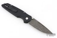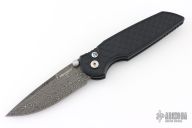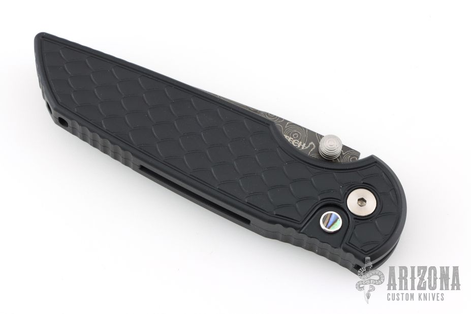 The TR-3 Integrity Folder is a well made knife with great fit and finish, just what you expect from Pro-Tech. This Integrity folding knife features a Damascus blade with dual titanium thumbstuds, and swedge. The handle is milled black aluminum, with Reptile texture, and abalone inlaid button. Has a deep carry pocket clip. Comes with original box, pouch, and papers. Excellent condition.