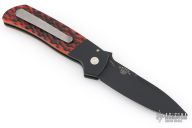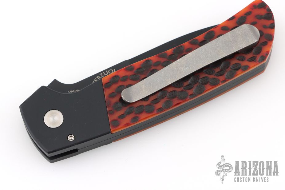 This ATCF Auto by Pro-Tech features a DLC Magnacut blade with notched thumbrest. The handle has a black aluminum frame with jigged bone scales, tip up milled titanium clip with hidden screws. Comes with original box, pouch, and papers. Excellent condition.