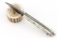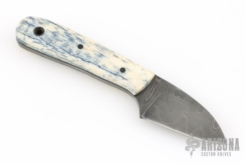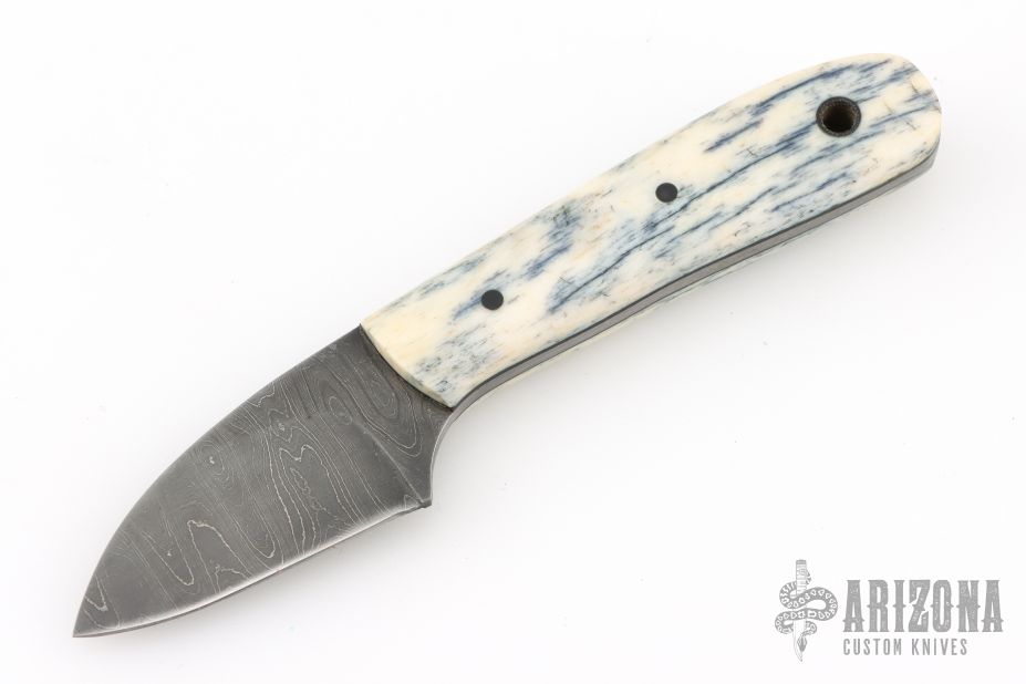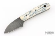 This knife by OP Bunch features an Alabama Damascus blade with .130" blade stock and 1.126" blade depth, full tang construction. The handle has stabilized giraffe bone scales with black liners and pins, lanyard hole at the butt. Excellent condition.
