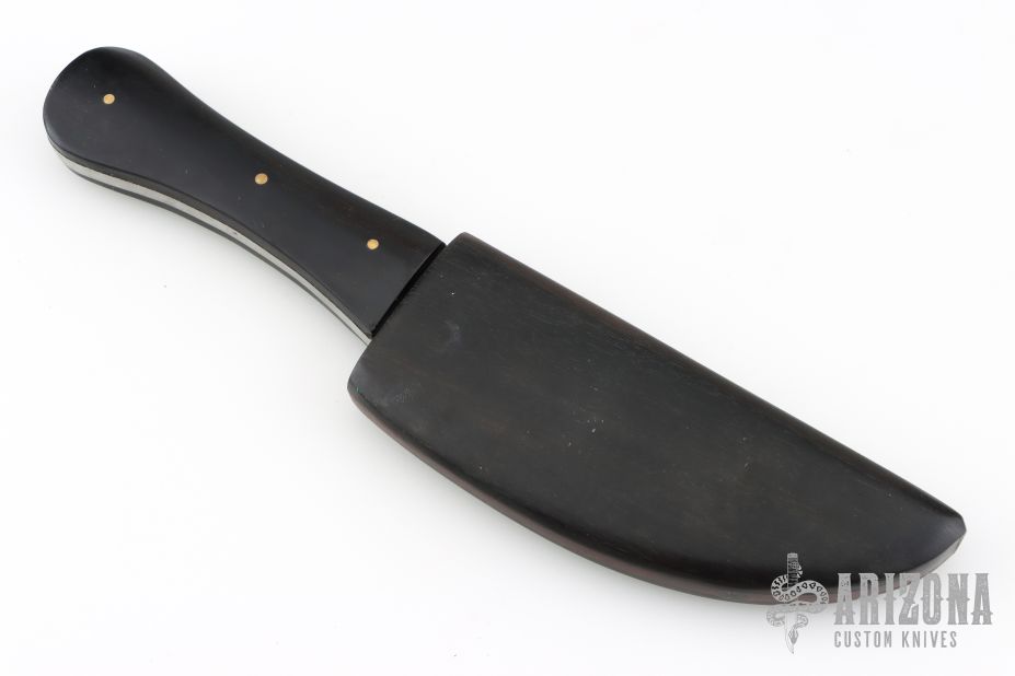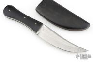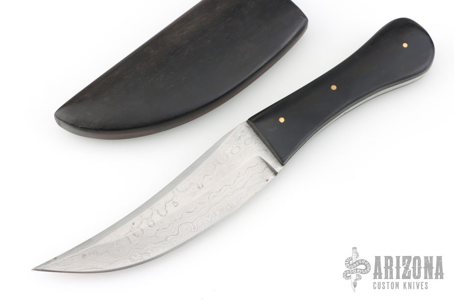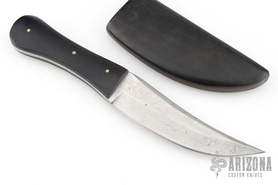 This Damascus Persian Fighter by Marcelo Zapatero features a Damascus blade with false top edge, .163" blade stock and 1.397" blade depth, full tang construction. The handle has ebony wood scales with brass pins. Comes with a matching ebony wood sheath. Has a few spots on the blade, otherwise good condition.