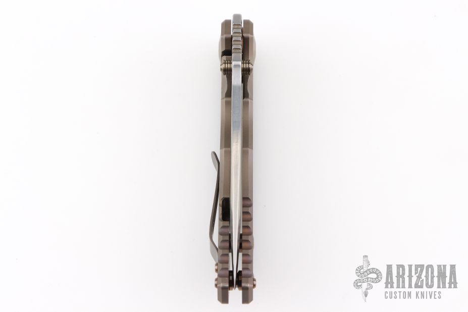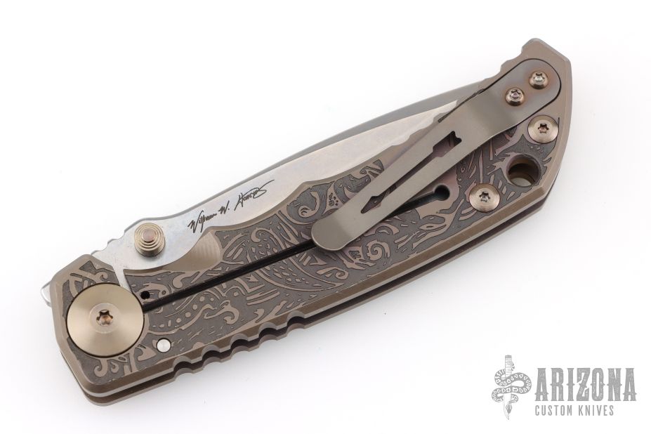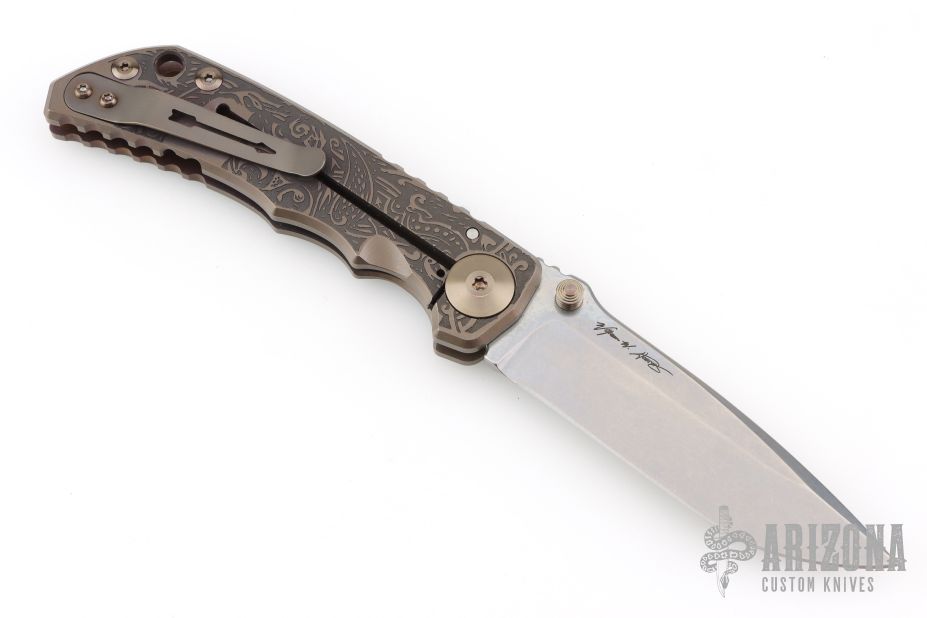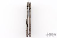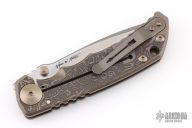 This Harsey framelock folder by Spartan Blades features a stonewashed drop point Magnacut blade with dual thumbstuds and a notched thumbrest. The handle has an anodized titanium frame with a laser engraving a tip up titanium clip and filler tab. Has nice detent, lockup, and blade seating. Comes with original box, and COA. Excellent condition.
