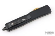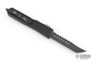 This Ultratech Hellhound by Microtech Knives features a black stonewash DLC blade with notched thumbrest and fullers, false top edge. The handle has a black aluminum frame with Ultem top and button, with tip down black stainless steel clip, black DLC hardware, black titanium thumbslide. Dated 07/2023. Comes with original box and papers. Excellent condition.  Has some scuffs on the clip. Excellent condition otherwise.