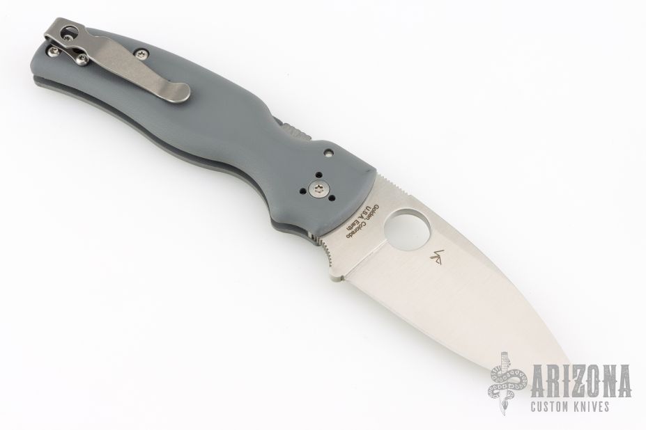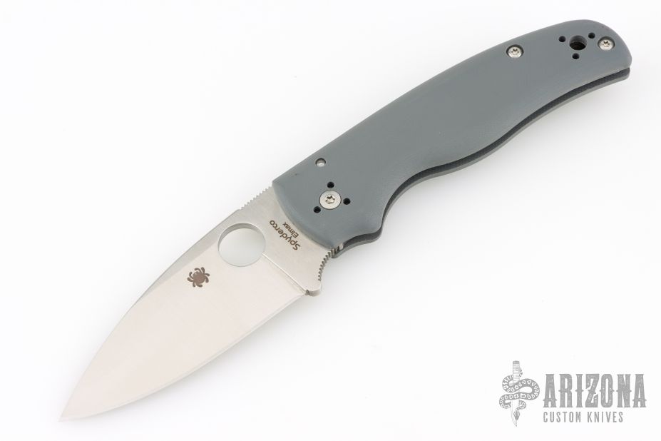 The new BladeOps Exclusive Spyderco Shaman features a gray G-10 handle, skeletonized stainless steel liners, a satin finshed leaf shaped ELMAX blade, and Spyderco's trademark round hole opening feature.