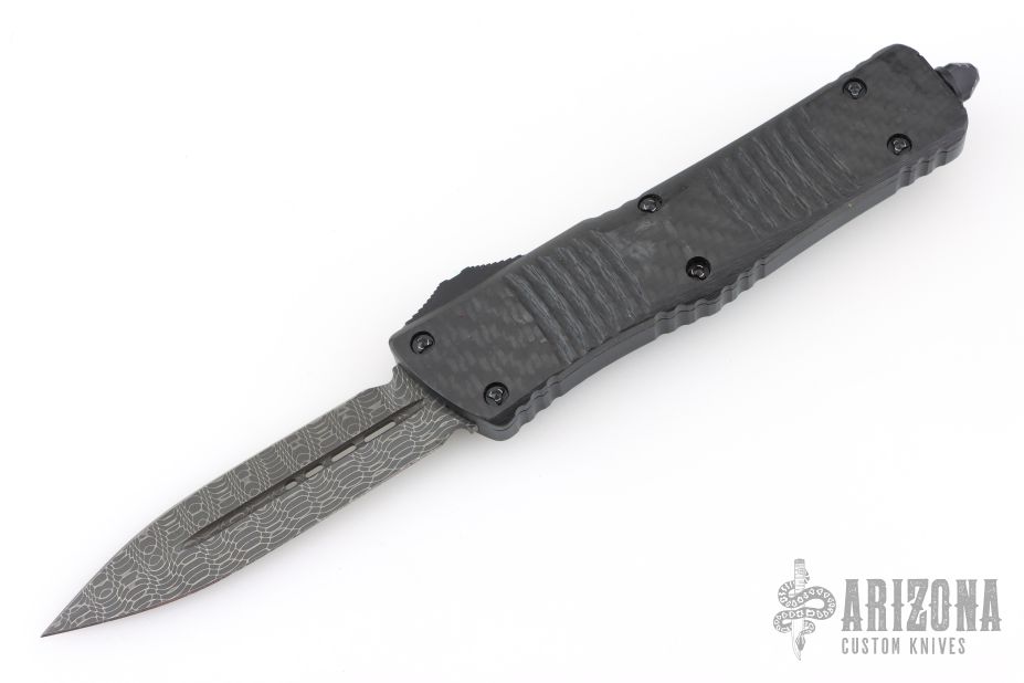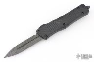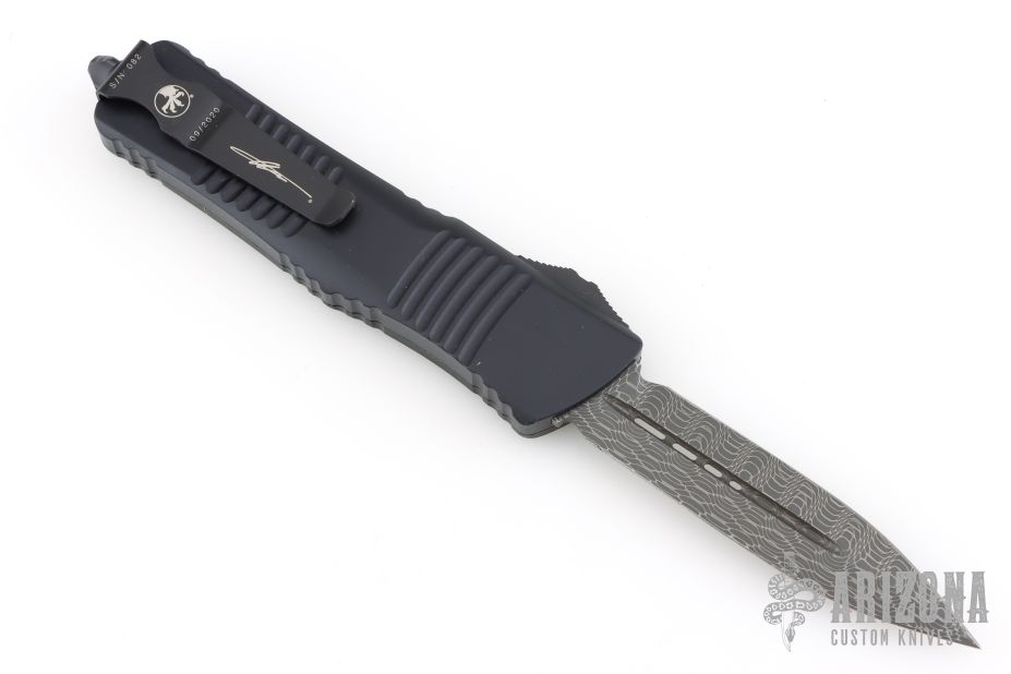 This Combat Troodon by Microtech Knives features a Damascus double-edged blade. The handle is black aluminum and carbon fiber, ringed titanium screws, and a black stainless steel pocket clip. The handle is marked "A. Marfione" and dated 09/2020 and #082 and claw logo. Comes with original box and papers. Excellent condition.