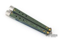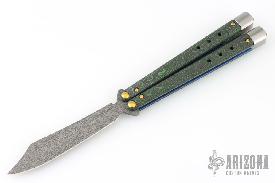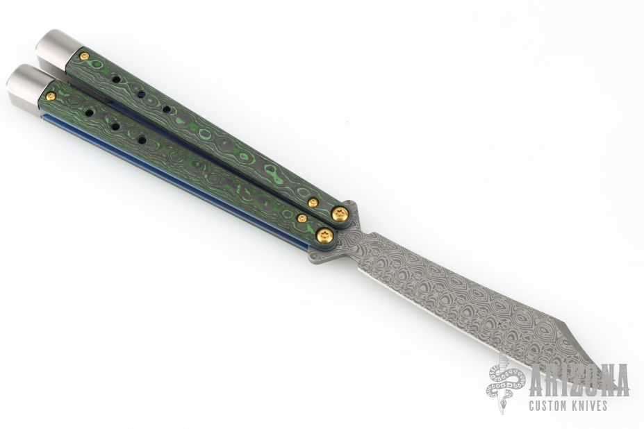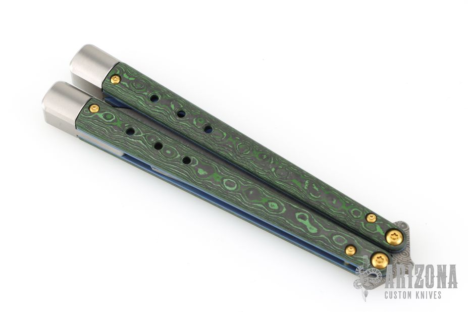 Harkening back to the ingenuity of Benchmade’s founder, Les de Asis, an unemployed craftsman who handmade the first Bali-Song® in his garage and turned the butterfly knife into an American-made icon, the new 99-242 Necron™ is a premium Gold Class ode to Les’s life’s work. Featuring our signature latchless design with adjustable weights, brushed titanium handle extensions, and blue anodized titanium liners, the 99-242 wields an elegant scimitar blade made of exclusive Monarch™ Damasteel®. With handles made of Jungle Wear Fatcarbon® — complete with a black alligator leather sheath — the 99-242 Necron™ just might steal the show.