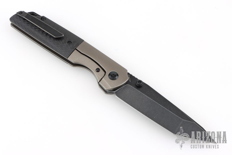 - Black stonewashed tanto blade made from CPM-35VN stainless steel.