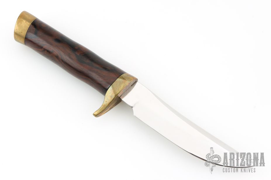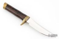 This Hunter by RWJ (please let us know if you know who this is) features a hand rub satin finished blade with false top edge, .140" blade stock and 1.022" blade depth, hidden tang construction. The handle has a brass guard and butt with cocobolo grip. Has a few very light scratches, otherwise excellent condition. "71" on the blade.