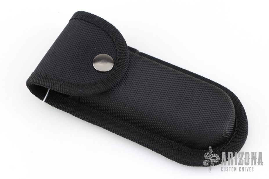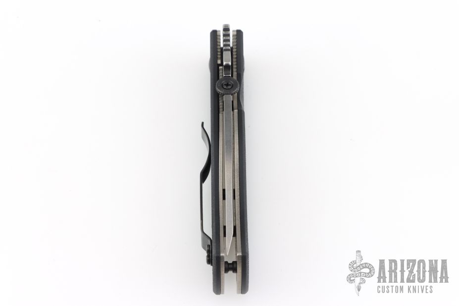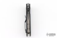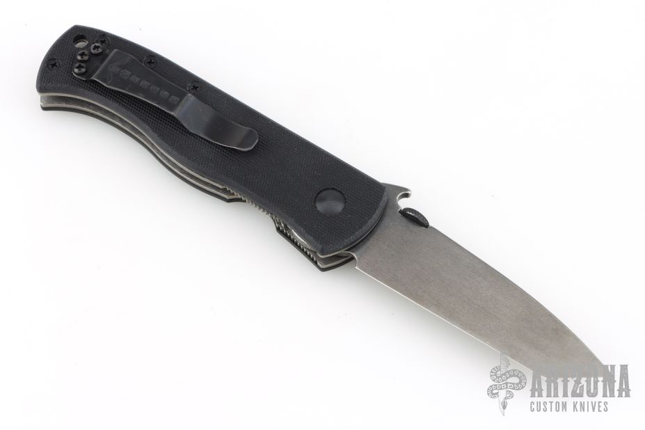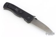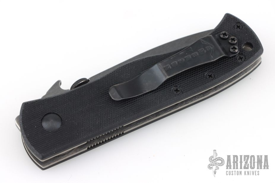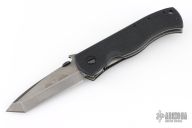 This CQC-7 from Emerson features a black chisel ground tanto blade with notched thumbrest, thumb disc and wave feature. The handle has black G-10 scales, titanium liners, black G-10 standoffs, and a tip up black stainless steel clip. Nice detent, lockup and blade seating. Comes in a nylon belt sheath. Has some marks on the clip, overall great condition.