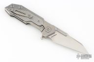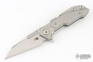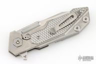 This Fulltrack flipper from Rick Hinderer Knives features a stonewash finished blade with notched thumbrest and flipper. The handle is stonewash finished titanium with inlaid titanium scales that can be removed to reveal a hidden pocket/storage area that was designed to hold additional pivot washers. This entire knife can be field stripped using a tool that rests between the handle scales. The tool has a spring that holds the tool between the standoffs. Come with Tri-Pivot system. Comes with original box, a set of red G-10 scales and extra hardware. Excellent condition.