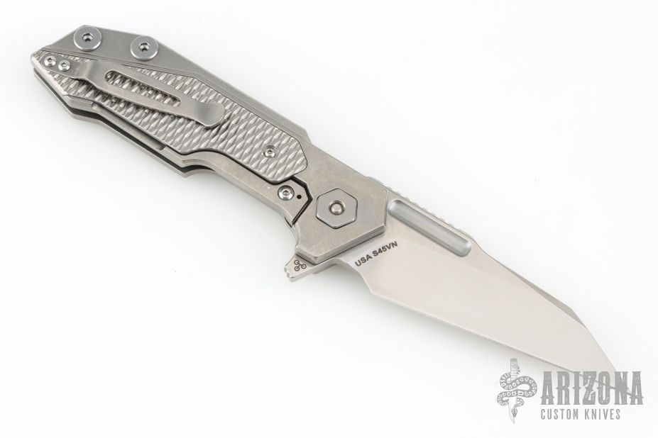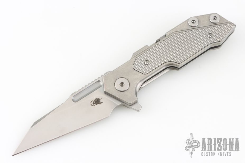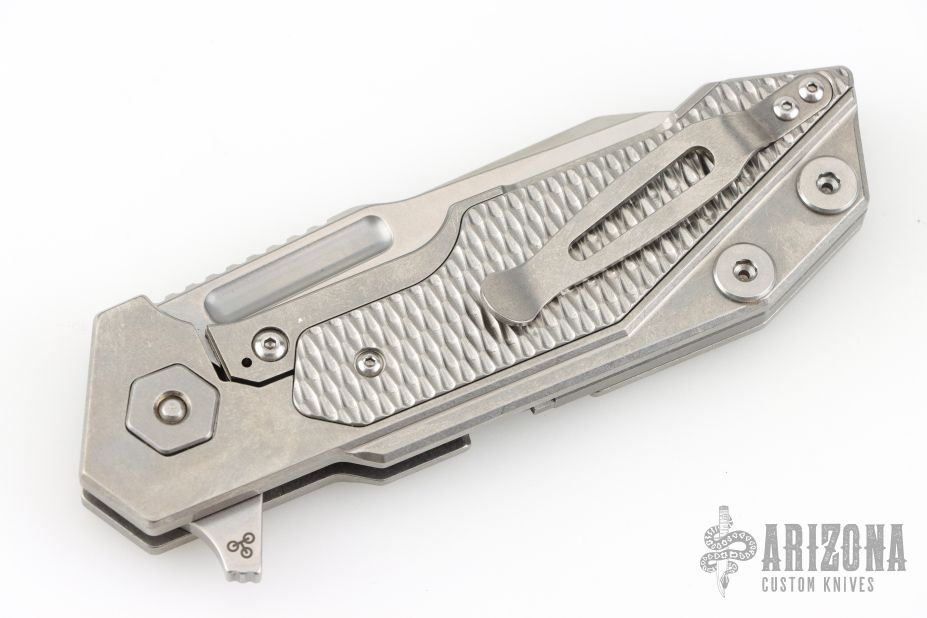 This Fulltrack flipper from Rick Hinderer Knives features a stonewash finished blade with notched thumbrest and flipper. The handle is stonewash finished titanium with inlaid titanium scales that can be removed to reveal a hidden pocket/storage area that was designed to hold additional pivot washers. This entire knife can be field stripped using a tool that rests between the handle scales. The tool has a spring that holds the tool between the standoffs. Come with Tri-Pivot system. Comes with original box, a set of red G-10 scales and extra hardware. Excellent condition.